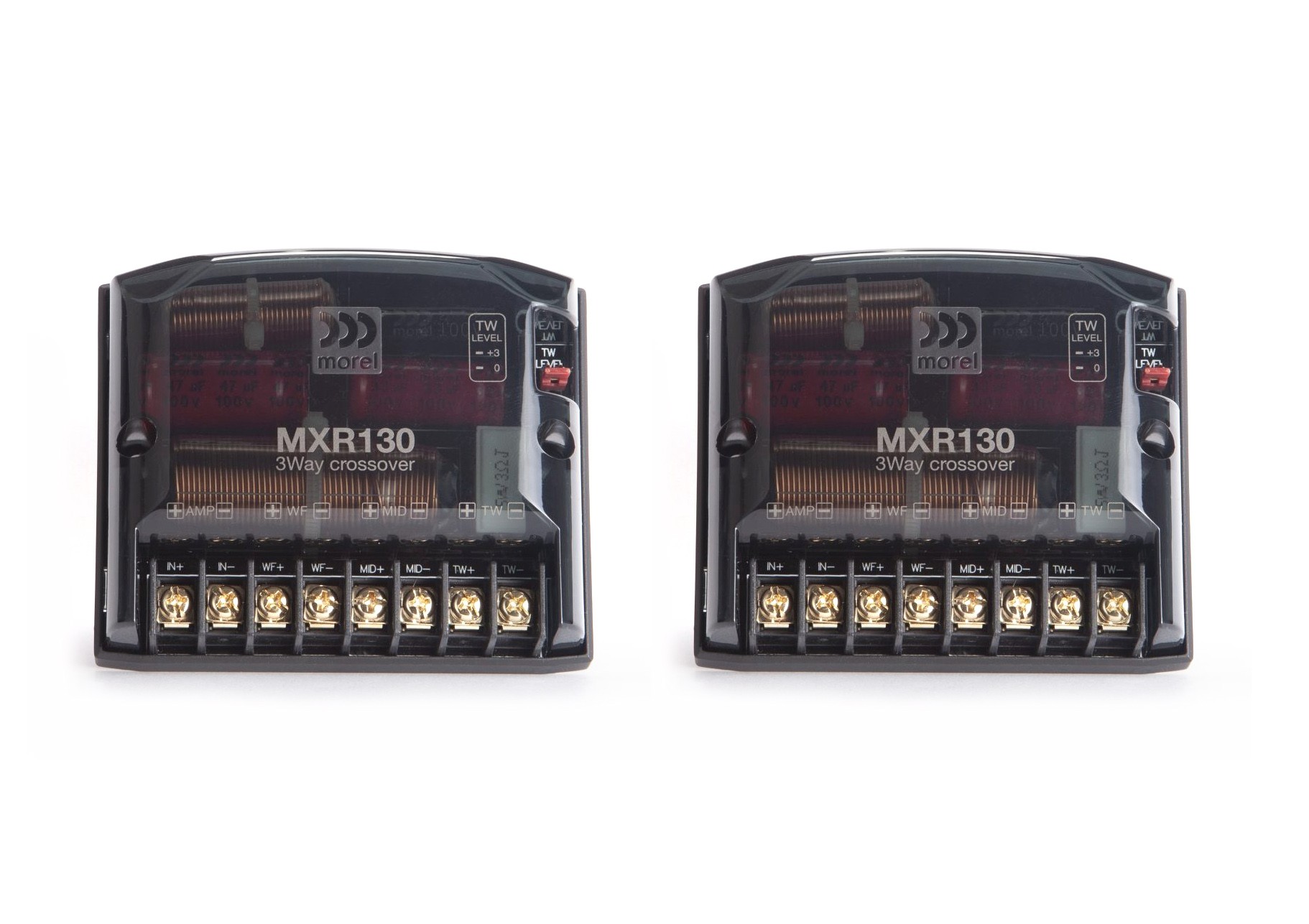 3-лентовите кросоувъри Morel MXR130 от моделните серии Virtus и Maximo Ultra са проектирани за пълна интеграция на компонентите с прецизно настроени акустични параметри за високочестотните, средночестотните и басовите говорители. Кросоувърите Morel MXR130 комбинират няколко нови концепции и функции, които подобряват звуковото представяне и качеството на звука на системите Morel.- 450Hz/4500Hz LP/BP/HP