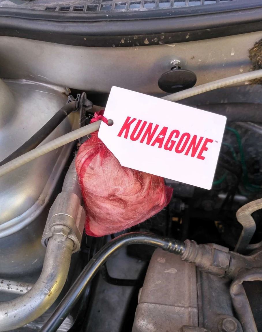 Опитайте Kunagone - изпитана защита срещу куни! Това е продукт, който се основава на инстинктивното поведение на животните. Той освобождава естествен аромат, който ги отблъсква, и вашият автомобил (таванско помещение, покривът на къщата ви) ще стане „неатрактивен" за тях. Ефективността е потвърдена при тестове и наблюдения в продължение на 12 месеца, провеждани в домове, където куните причиняват щети на таваните и под капацитетите на автомобили. Ефективността се дължи на уникална смес от козина от няколко породисти кучета, подбрани от конкретни фризьори. Тази смес преминава топлинна обработка, съдържа аромати, отблъскващи диви животни, и растителен восък, който удължава функционалността на продукта. Начинът на приложение и съставът са патентовани.