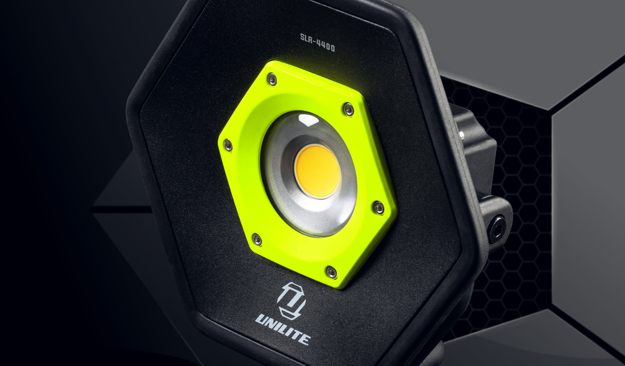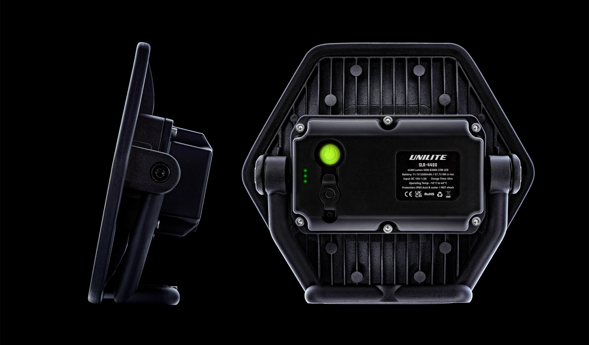 Акумулаторната лампа SLR-4400 осигурява ултра силен изход от 4400 лумена. Разполага с двойно захранване, което може да се използва чрез вградената акумулаторна батерия или да се включи директно в електрическата мрежа. Лампата е изработена от закален, пресовано алуминиево тяло с изключително устойчива защита при удари IK07. Степента на защита IP65 осигурява висока защита срещу вода и прах, а здравата му 180° регулируема стойка/дръжка позволява поставяне в много позиции. Тази лампа може също да се използва със всички стативи Unilite и допълнителни магнити. Доставя се с мрежово зарядно с адаптери за UK/EU/US/AUS.