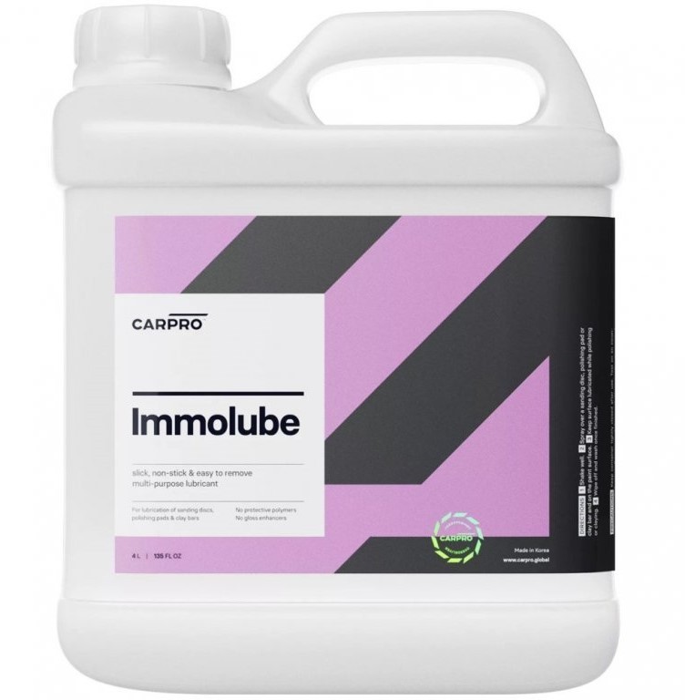 CarPro ImmoLube е универсален лубрикант - специална смес от смазващи съставки, проектирани да намаляват триенето при шлайфане, полиране или clay-обработка. Повишената вискозитет предотвратява увреждане на лака. CarPro ImmoLube не съдържа полимери или допълнителни съставки, които биха пречили на наблюдението на хода на работата. Отстраняването на остатъците от продукта също е много просто. Може да се използва и за смазване на полиращия диск преди започване на машинното полиране, както и за повишаване на смазващите качества на полиращата паста по всяко време по време на полирането.