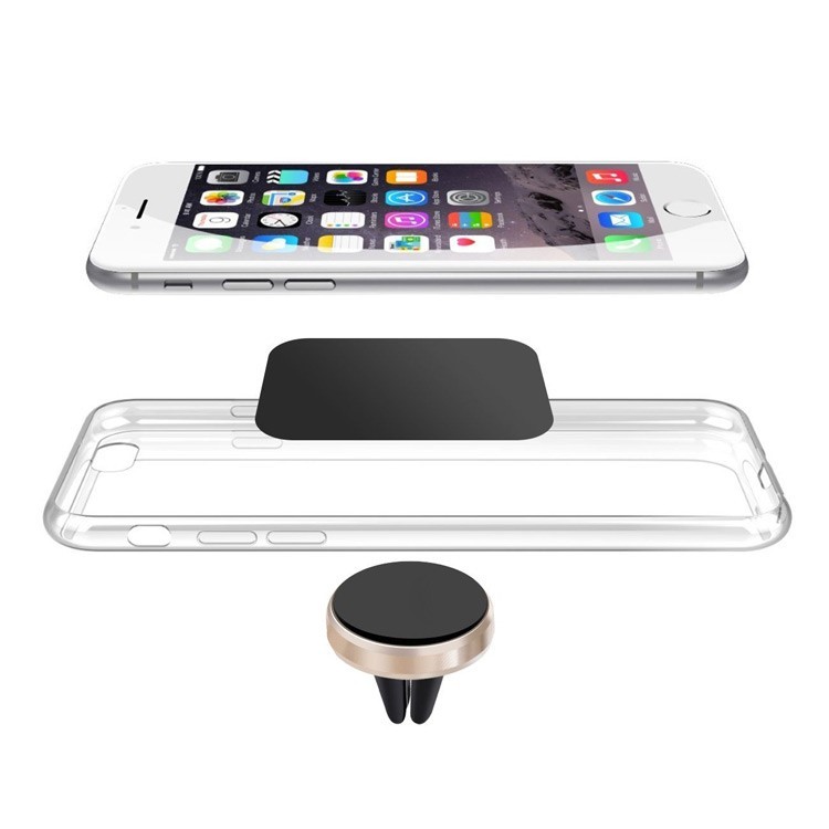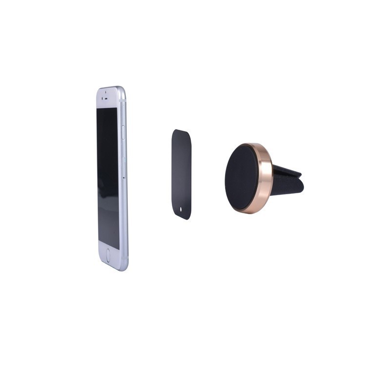 Изработка в черно и златно в цветова комбинация с магнитна повърхност. Предназначен за поставяне на решетката на въздуховода на вентилацията. Закрепване чрез просто поставяне на телефона върху магнитната повърхност. Към мобилния телефон се прикрепя метална пластина. При приближаване на телефона с тази пластина към държача, телефонът се привлича силно към контактната повърхност на държача.