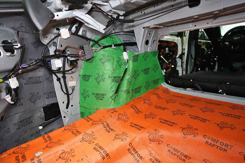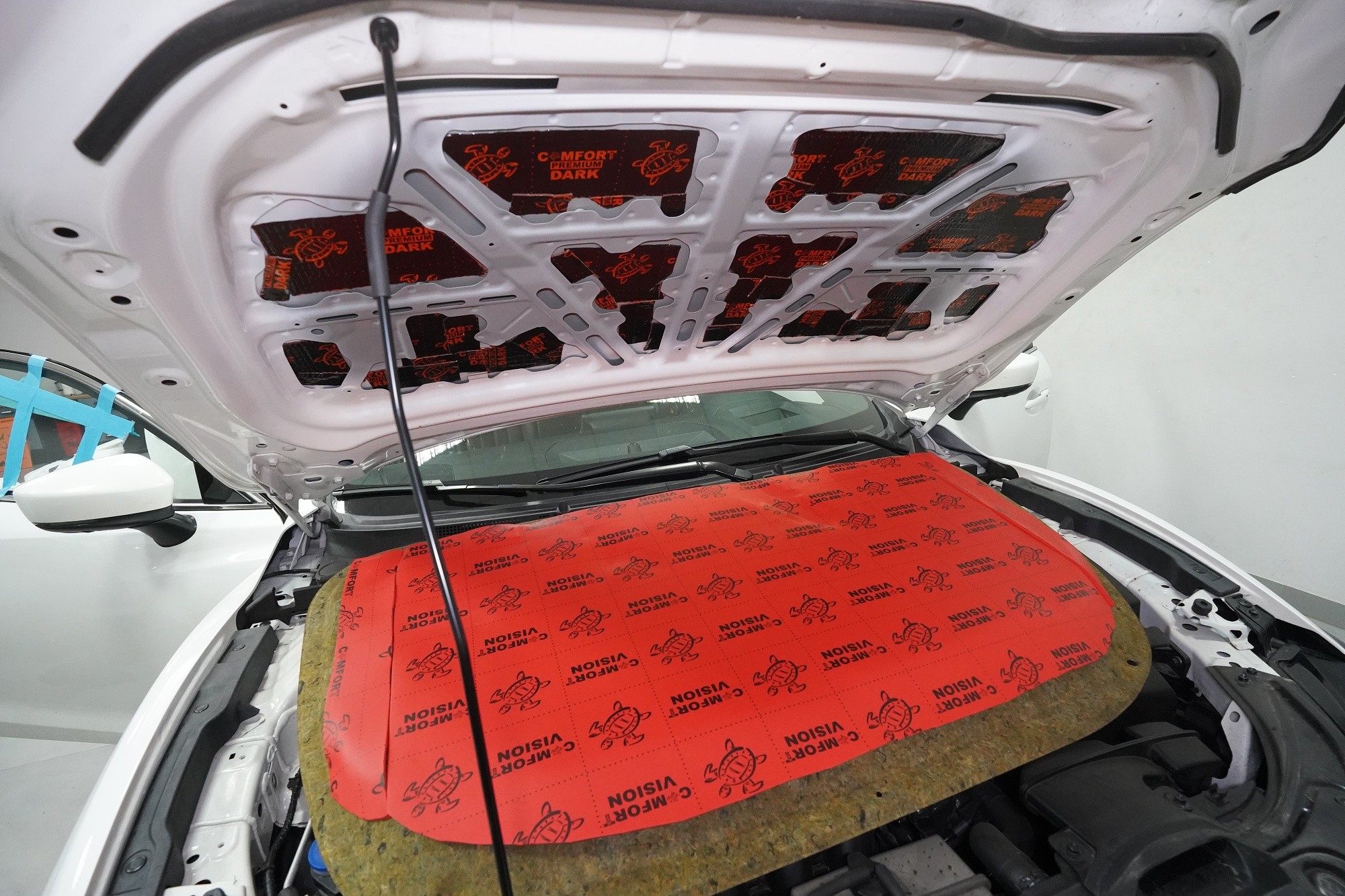 Odhlučnění vozu Mazda 6 a tedy již tradiční návštěvník naší dílny. Instalace byla tentokrát v rozsahu odhlučnění, který jsme tu ještě neměli, konkrétně v rámci balíčku Premium Plus. Mazda 6 bohužel patří k nejhlučnějším vozům ve své třídě a hluk motoru, hučení pneumatik, ale i aerodynamický hluk se stoupající rychlostí rychle zkazí dojem z tohoto prémiového japonského vozu. Zaměřili jsme se na všechny zásadní oblasti vozu kromě střechy, konkrétně tedy na přední, zadní a páté dveře, podlahu, zavazadlový prostor, přední i zadní podběhy z vnitřní strany a kapotu. U balíčku Premium Plus se intenzivněji věnujeme zejména podlaze a podběhům, kde aplikujeme špičkové materiály Comfortmat z profesionální řady Expert. Na instalaci pracovali zároveň 3 naši zkušení technici, kteří montáž zvládnou v rámci 1 pracovního dne. Více zajímavých informací o instalaci se dozvíte v naší fotoreportáži.