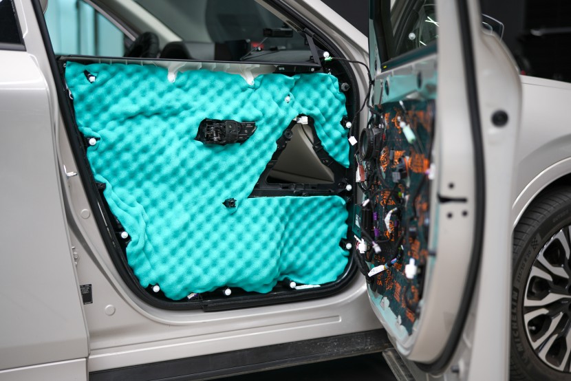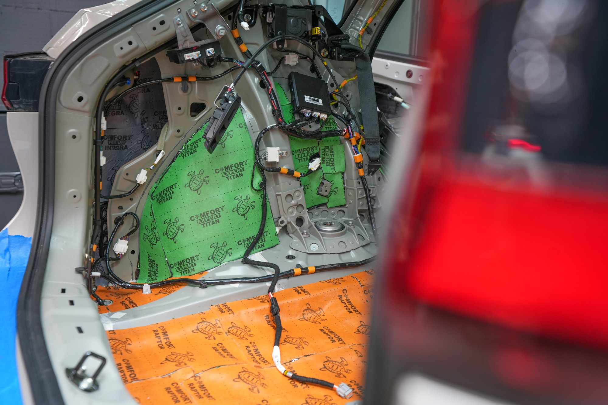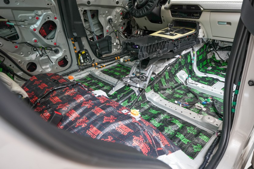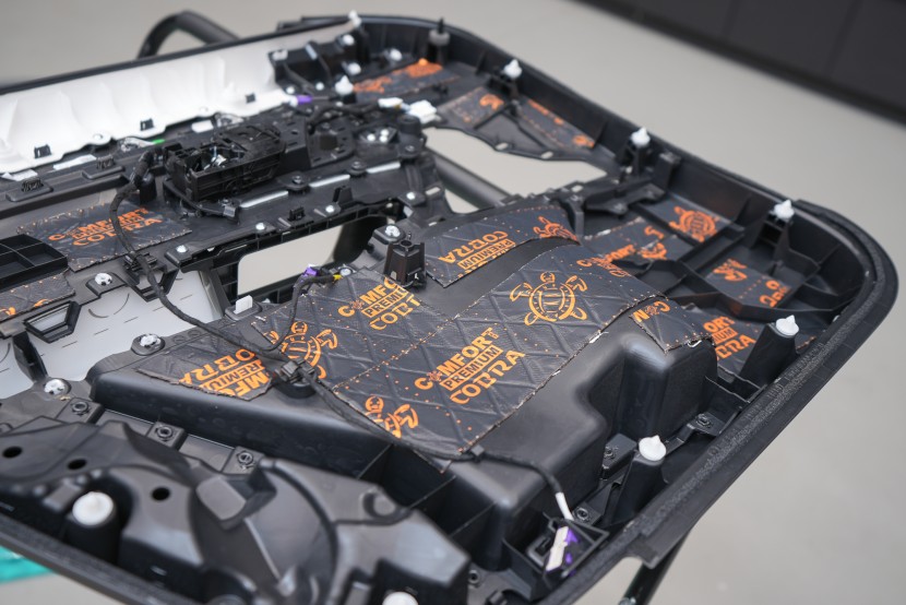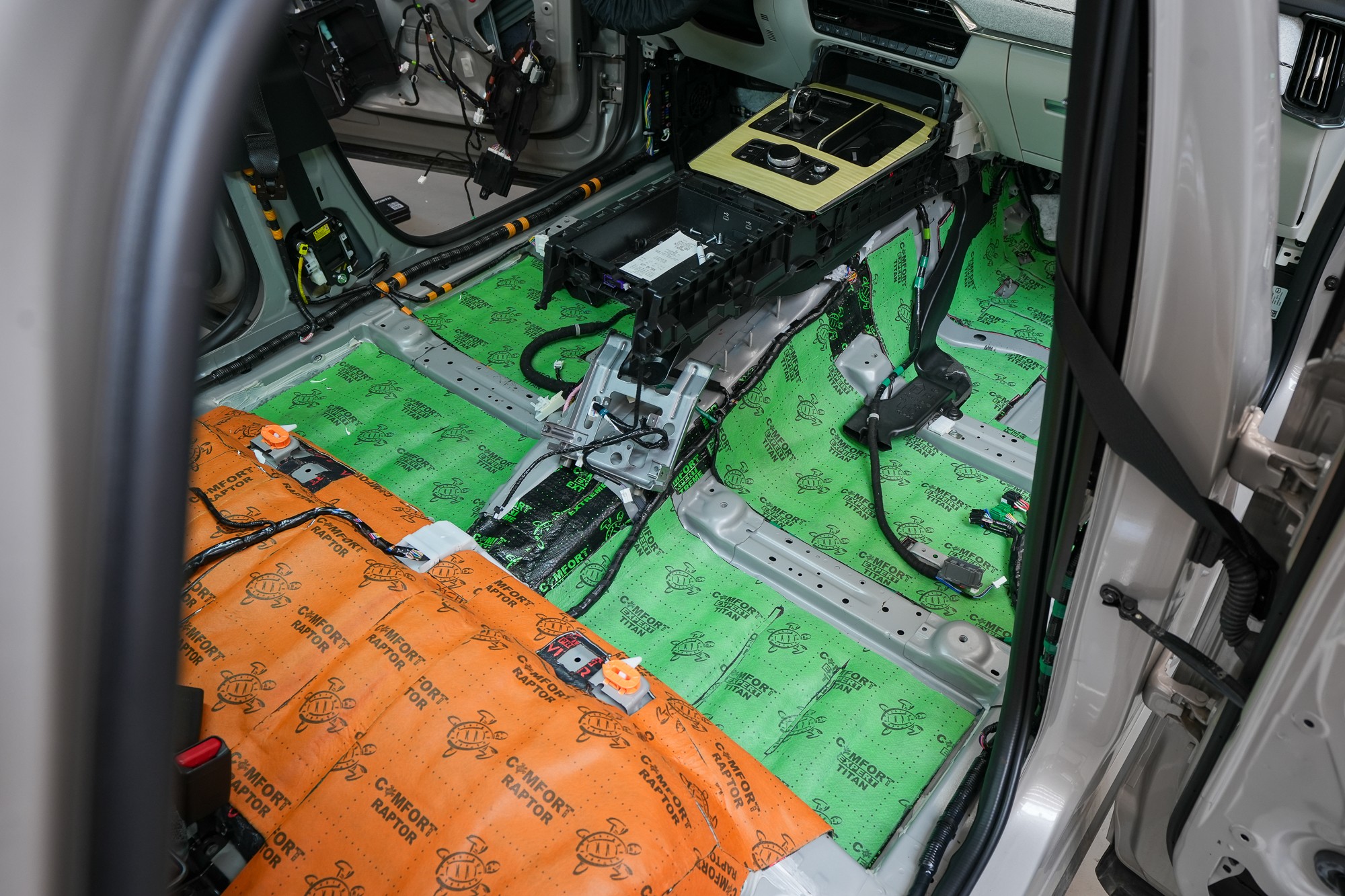 Клиентът затова се реши на шумоизолация в рамките на нашия пакет Premium Plus, който наскоро бе подобрен. Включихме в него ново звукоизолационно фолио Comfortmat Titan, което използваме за пода и калниците — две от най-напрегнатите области на каросерията. Titan, благодарение на способността си да намалява шума до 38 dB, представлява най-ефективния материал в момента и приносът му е видим веднага на практика. Двуслойното решение, комбиниращо материали от професионалната серия Expert, позволява максимален ефект в рамките на дадения обхват на шумоизолация.