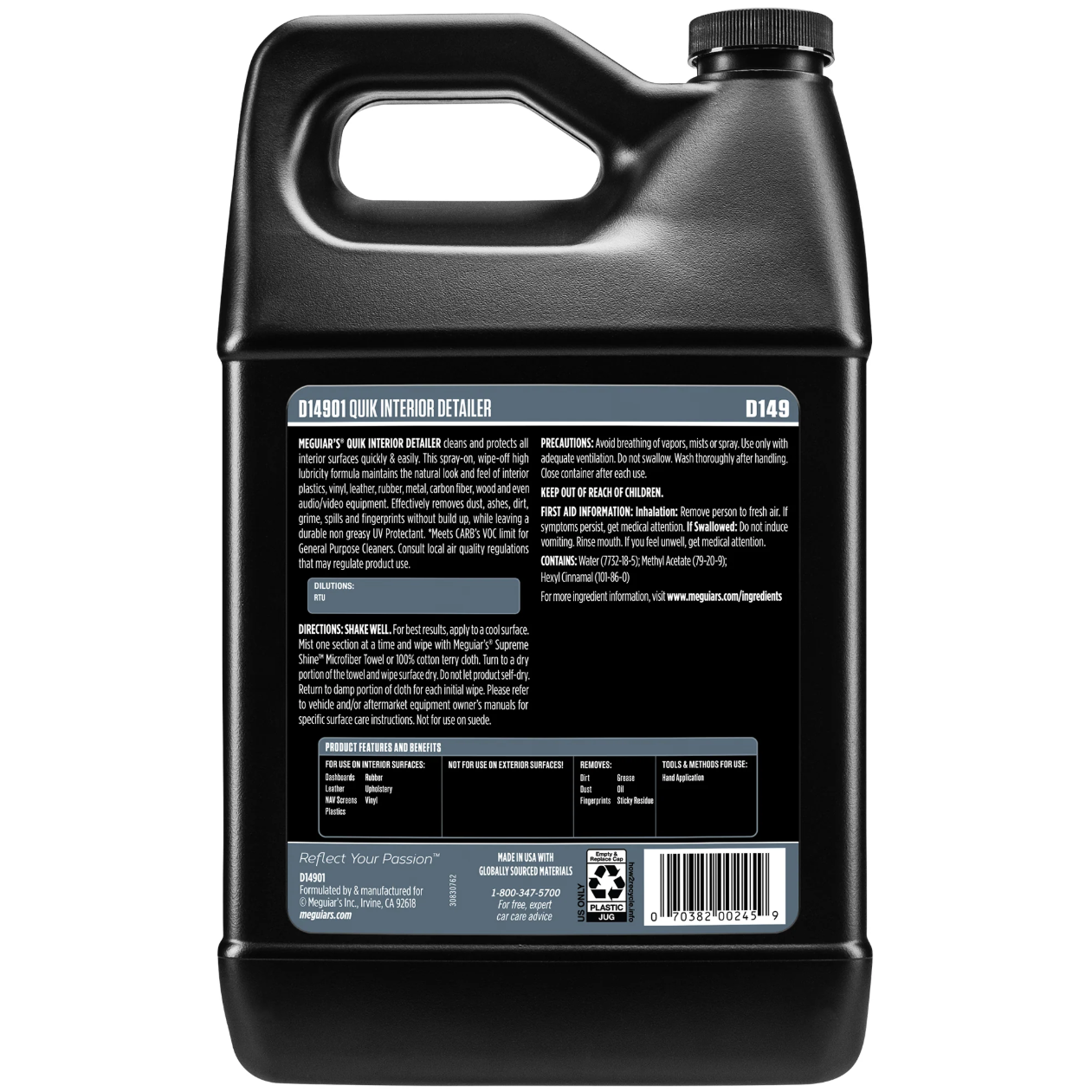 Meguiar’s Quik Interior Detailer е мощен и в същото време нежен спрей-детаилер, предназначен за почистване на интериора на автомобила. Неговата деликатна, високо смазана формула позволява безопасно и ефективно премахване на прах, отпечатъци от пръсти, мазнини, замърсявания и петна от пластмаса, винил, кожа, гума, метал, както и от сензорни и навигационни екрани. Продуктът съдържа UV блокери, които помагат да се защитят повърхностите от избледняване, напукване и стареене под влиянието на слънчевата светлина. След нанасяне повърхностите остават свежи и поддържани, без мазен филм или нежелан блясък - интериорът изглежда като току-що детайлиран.