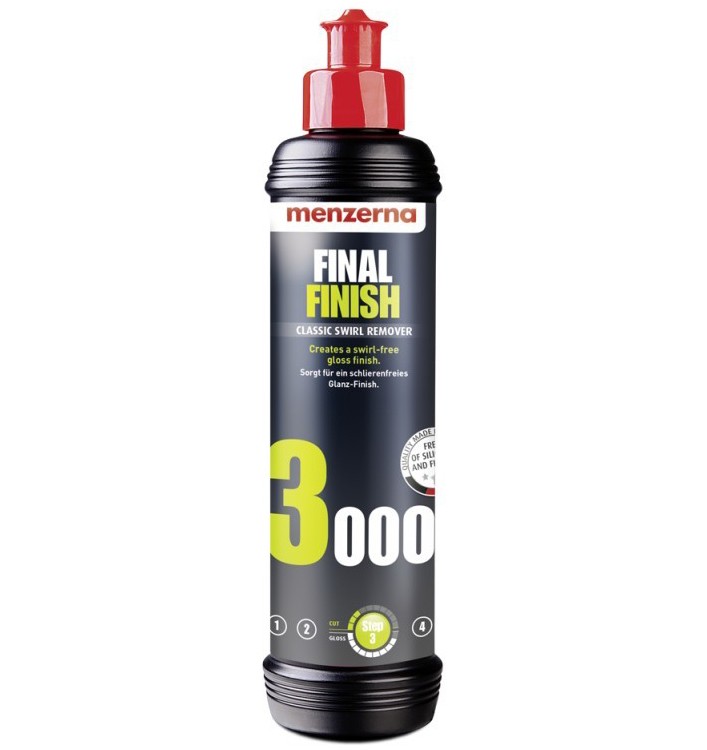 Menzerna Final Finish е фина финишна полираща паста, която придава на повърхността на лака отличен блясък. Ефективно премахва малки дефекти в лака, като фини драскотини и холограми. Премахва зърнестост P3000. Не съдържа силикон. Почти не праши при полиране с машина.Основни характеристики
