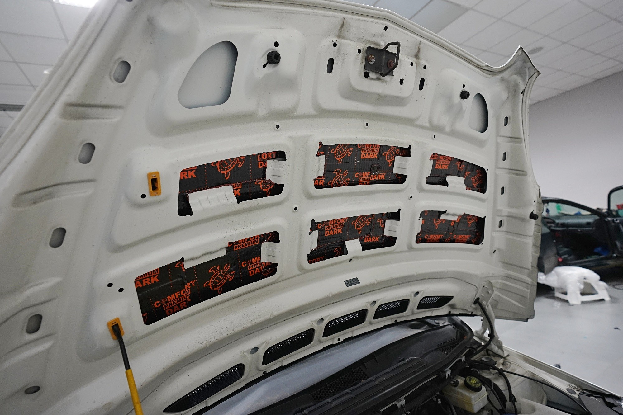 Шумоизолация на предните подкалници и капака на автомобил Mercedes-Benz B-Class. Собственикът на това превозно средство се оплакваше основно от шум в предната част, конкретно от предните колела и двигателя. Причинители са предимно гумите и разбира се двигателят. Силният нискочестотен шум от предните колела можем ефективно да намалим чрез antivibrační материал от моделната серия premium Dark с дебелина 4 mm. Той се справя както с вибрациите, така и с шума с най-ниски честоти. За средните и високите честоти след това се грижи многослойният материал Comfortmat Blockshot, който благодарение на противошумна мембрана позволява звукова изолация до 30 dB. Него прилагаме върху пластмасовата част на подкалниците, с което ще предотвратим и шума от летящи камъчета. Капака шумоизираме също с два слоя. Първият е традиционно antivibrační материал Comfortmat D2 с дебелина 2,3 mm, който ще увеличи твърдостта на ламарината на капака и ще намали вибрациите в тази зона. Намаляване на шума постигаме чрез приложение на звуково и топлоизолационен материал Comfortmat Neoprene, с който ще заменим липсващия оригинален капак на двигателя.Показване на продуктиСкриване на продукти