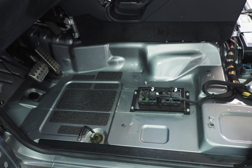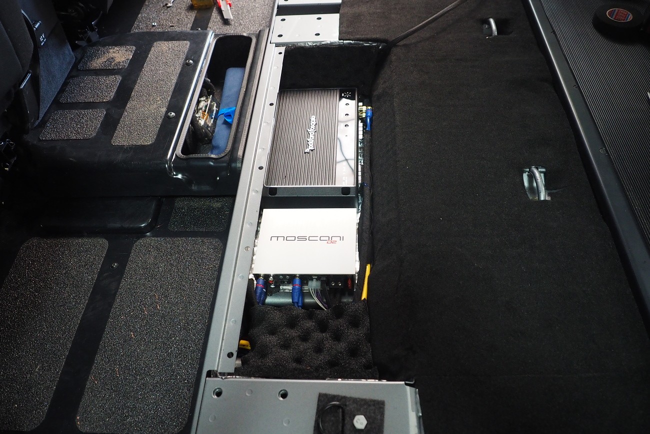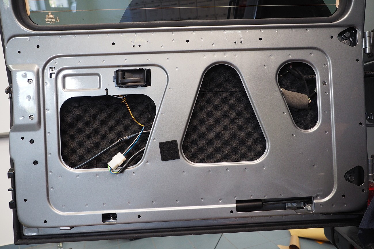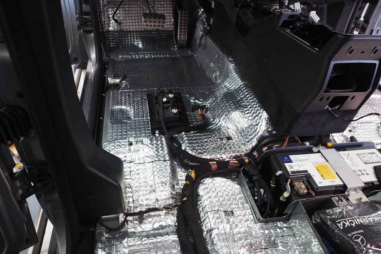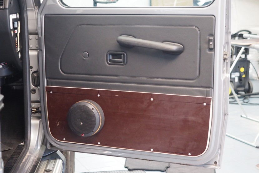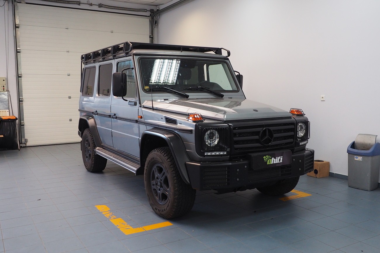 Много трудоемък монтаж на автомобил Mercedes-Benz G-Class, за който прекарахме общо 48 часа. Този автомобил, подобно на например Land Rover Defender, от завода няма никаква звукоизолация. Затова обезшумихме целия автомобил: всички врати, целия багажен/заден обем, пода, тавана и вътрешните арки. Дойде ред и на озвучаването. Инсталирахме звуково усъвършенствани говорители Rockford Fosgate от серията Power, които свързахме към първокласен усилвател Mosconi с DSP процесор. За басовата част отговаря нов субуфер на марката Kicker, който се захранва от моноблок Rockford Fosgate.