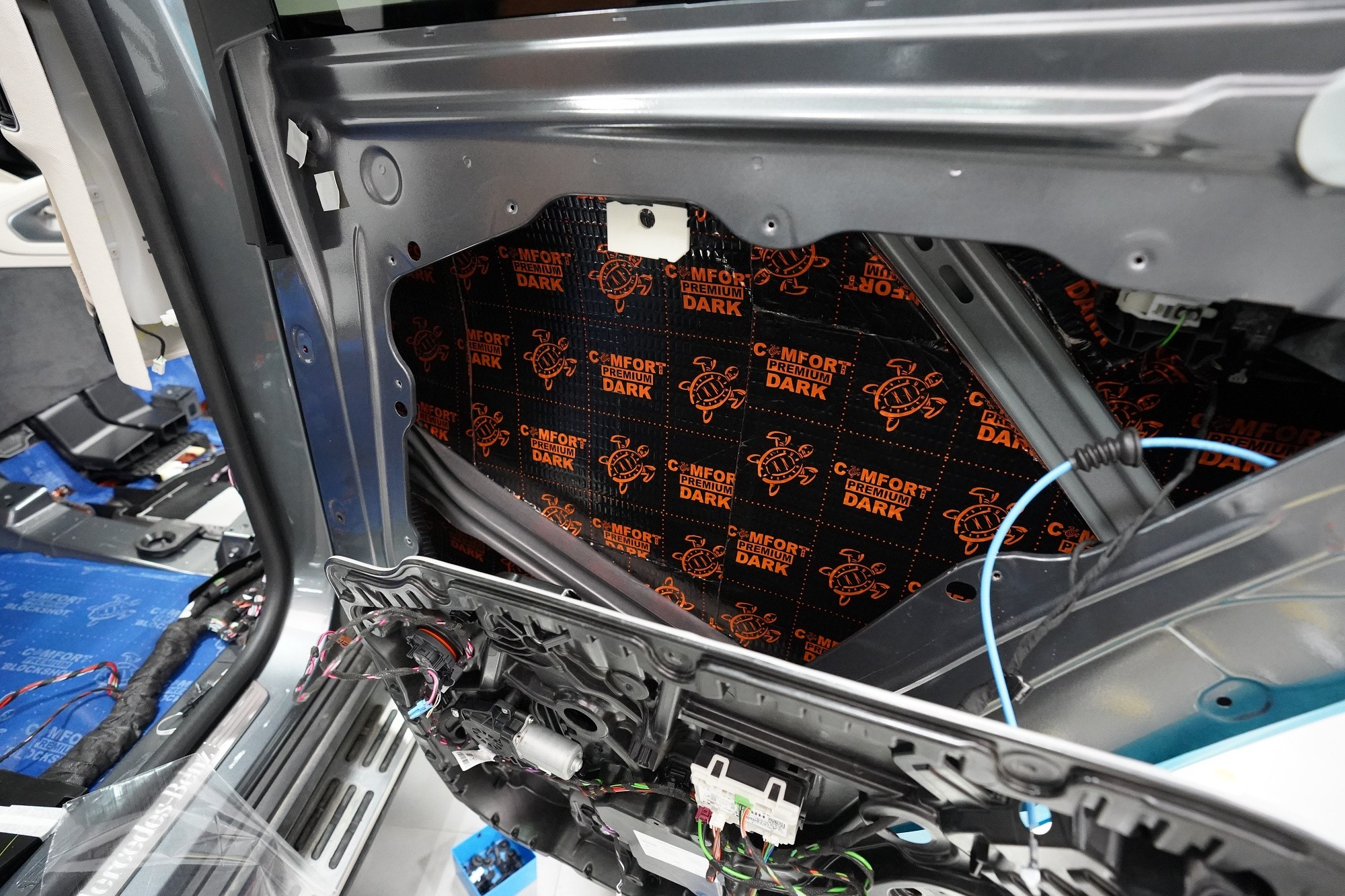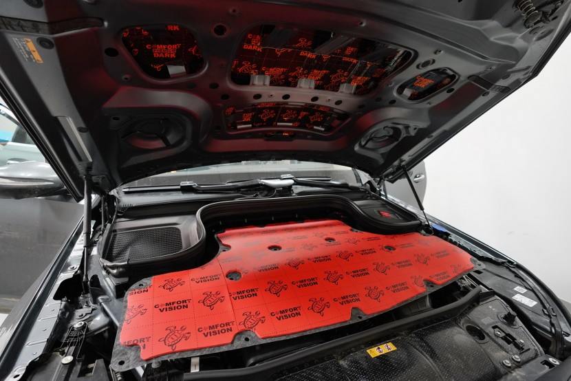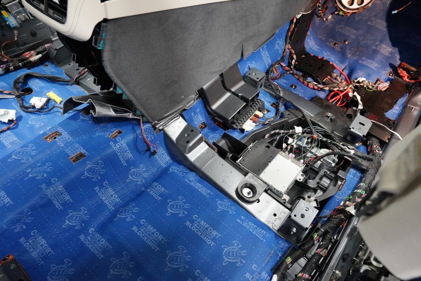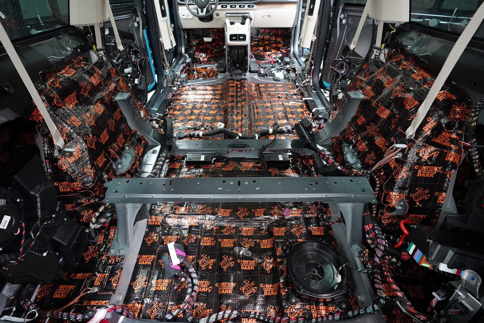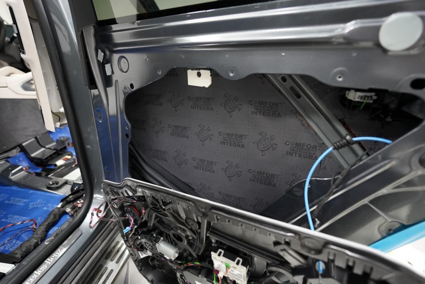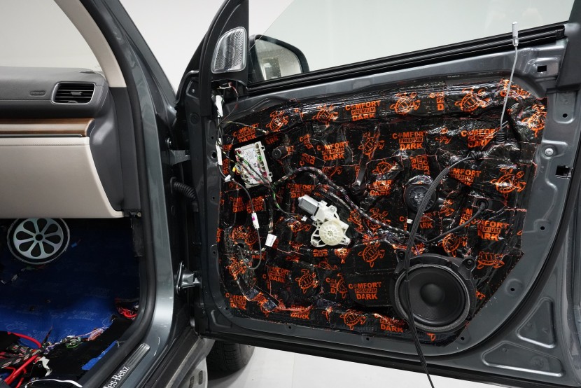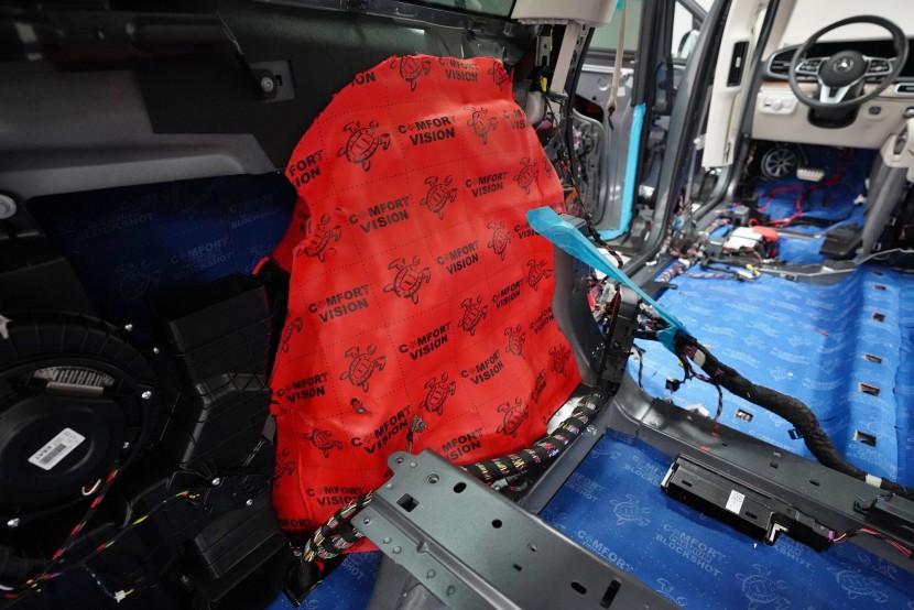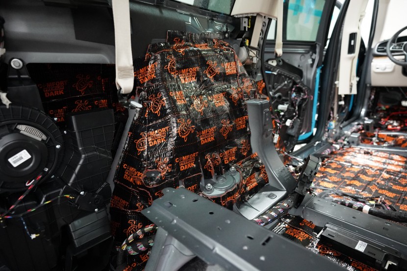 Шумоизолация на луксозния SUV Mercedes-Benz GLS. Този автомобил е пример, че дори толкова скъп автомобил не разполага с достатъчна заводска изолация срещу шум. Собственикът на този красив автомобил вече бе при нас за шумоизолация на Audi Q7, чието фабрично шумоизолиране също не го удовлетворяваше. След инсталацията и свикването с новия по-висок комфорт на своето Audi, не ни изненада, че новият Mercedes-Benz GLS няма да отговори на високите изисквания на неговия собственик по отношение на шумоизолацията и това беше голямо разочарование за иначе безупречния автомобил. Най-големият проблем според собственика беше изразеният шум от пода и от предните и задните колела. Съгласихме се на нашия пакет шумоизолация Premium с индивидуално решение за някои области. Той включва освен покрива, който в този автомобил е панорамен, шумоизолация на всички най-важни области на автомобила. Конкретно шумоизолирахме предни, задни и пета врата, пода, багажното пространство, предни и задни калници и предния капак. Както можете да видите на снимките, защитата срещу вибрации и звукова изолация на купето във вид на пянообразен материал, особено на пода и задните калници, е много недостатъчна и няма шанс да спре шума, особено нискочестотния, който представлява основния проблем при този автомобил. Голям акцент разбира се поставихме върху най-проблематичните области на автомобила и целият автомобил беше шумоизолиран с премиум анти-вибрационни и мембранни материали Comfortmat, които имат най-висока ефективност на съвременния пазар. Поради високата сложност на шумоизолацията при този тип автомобили времето прекарано на автомобила е увеличено с повече от 10 часа в сравнение със стандартните автомобили. Трябва да споменем, че това беше най-сложният за монтаж автомобил, който някога сме имали в сервиза, и също така използвахме най-голямо количество материал, ако изключим товарните автомобили. Въпреки това монтажът успяваме да приключим през 1 работен ден благодарение на присъствието на 4 наши опитни техници.