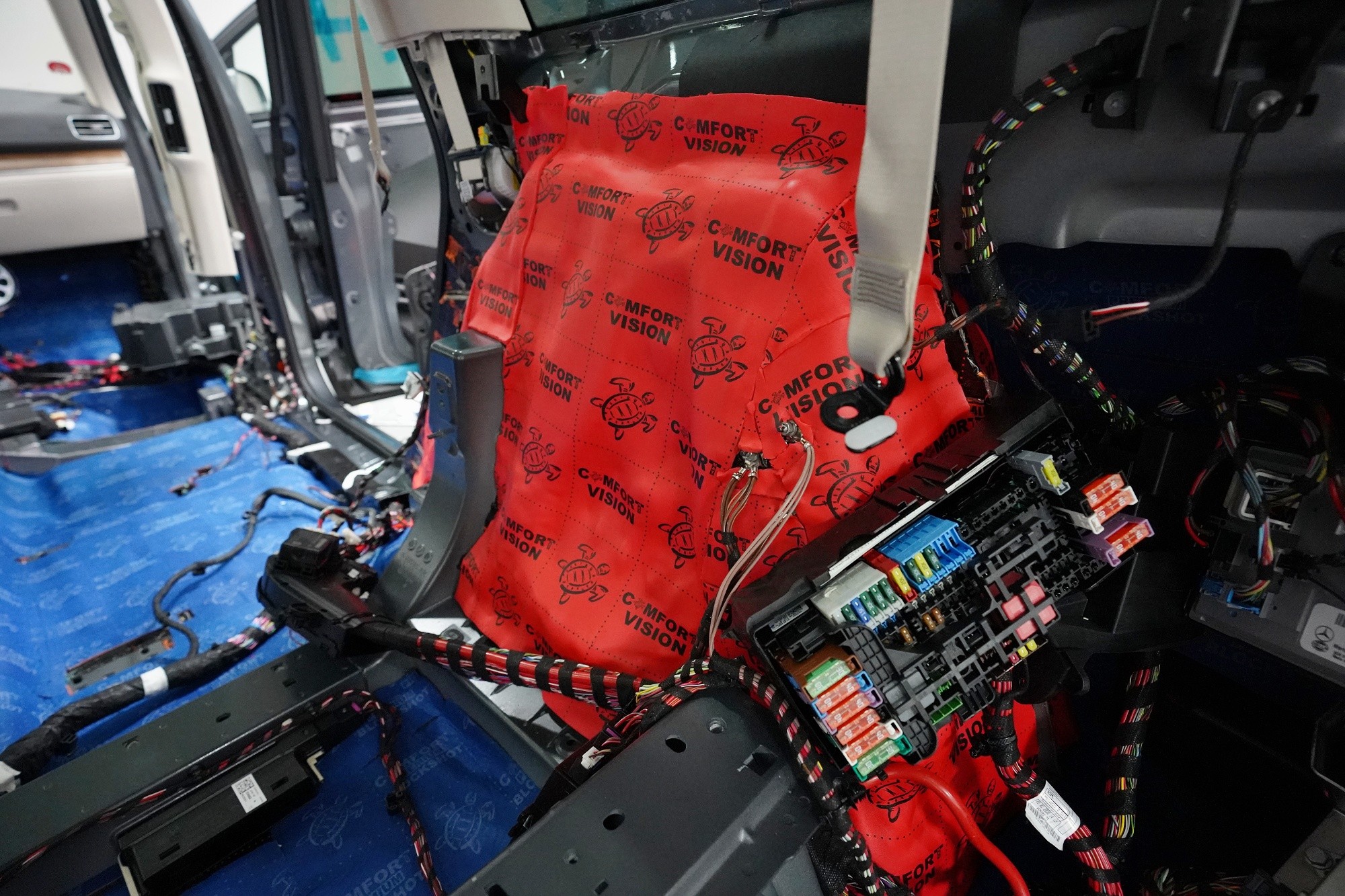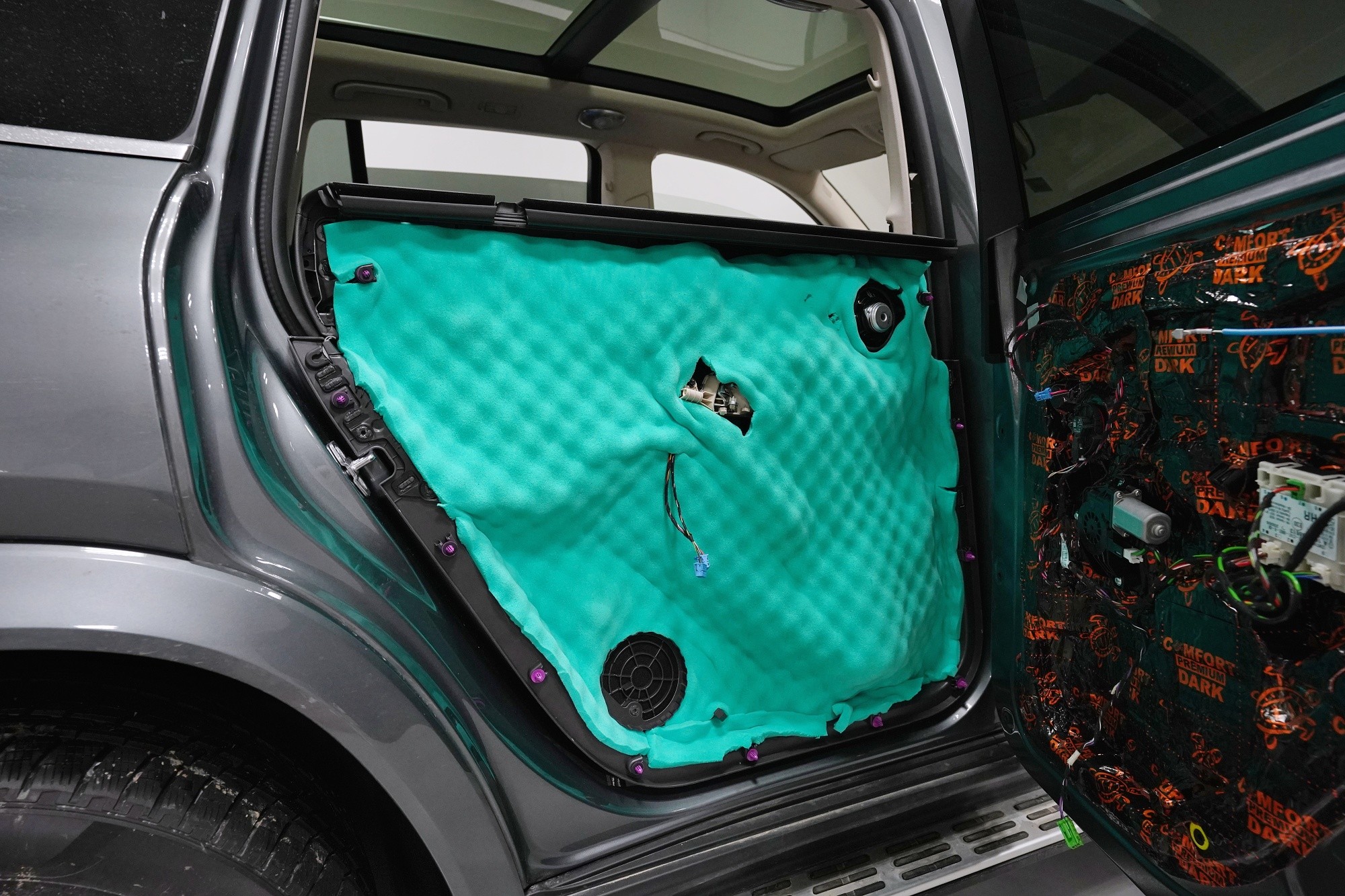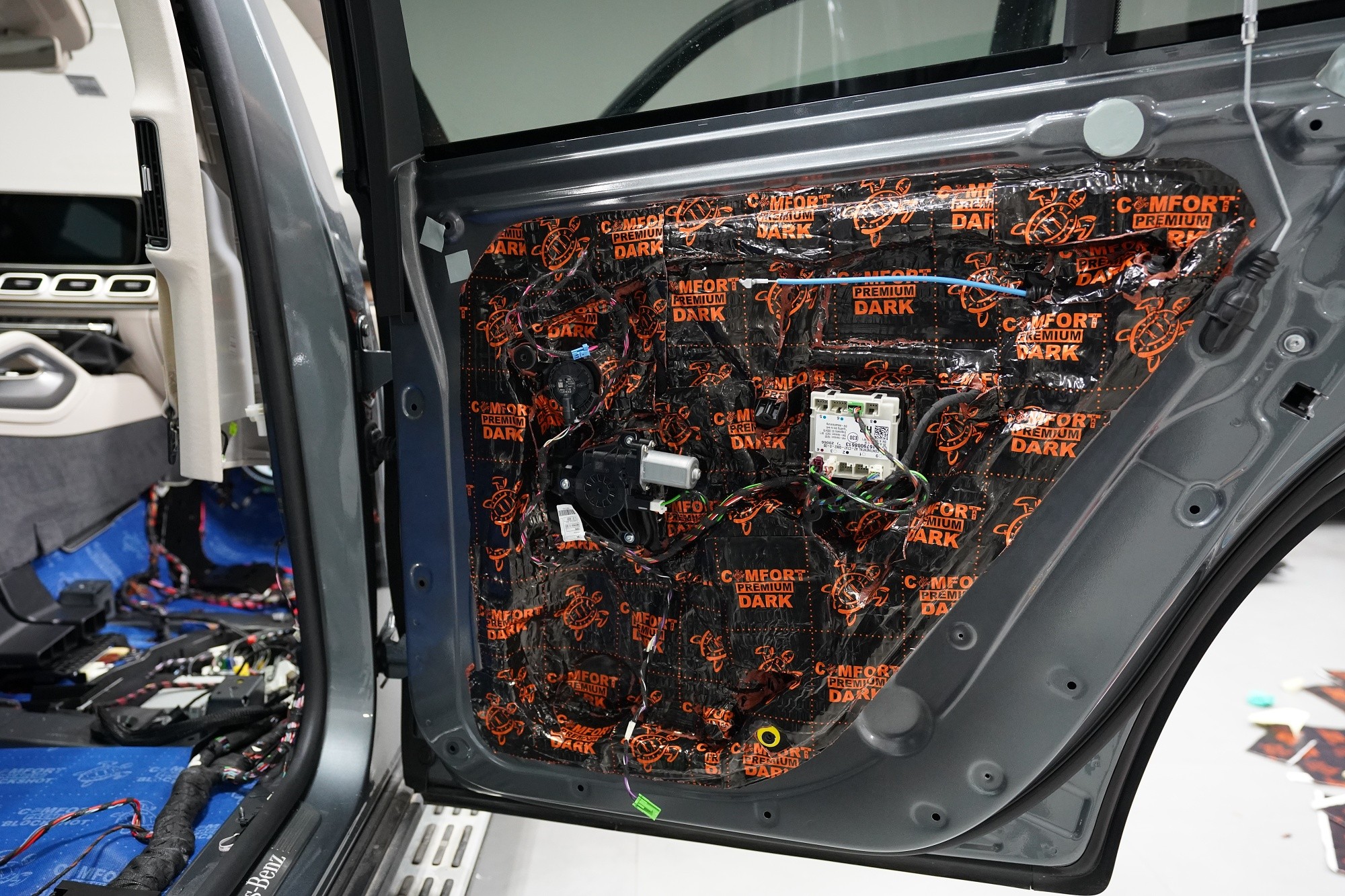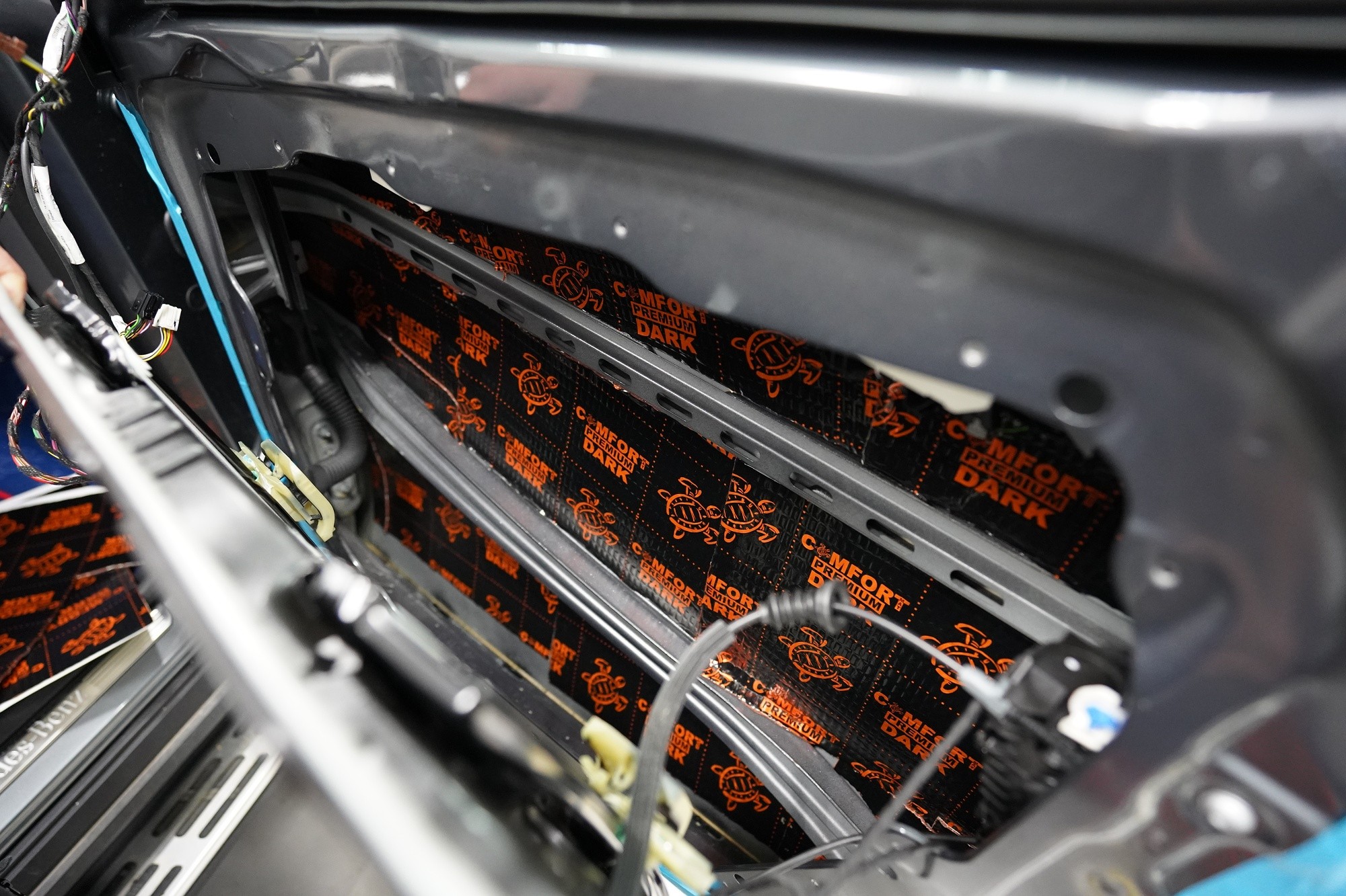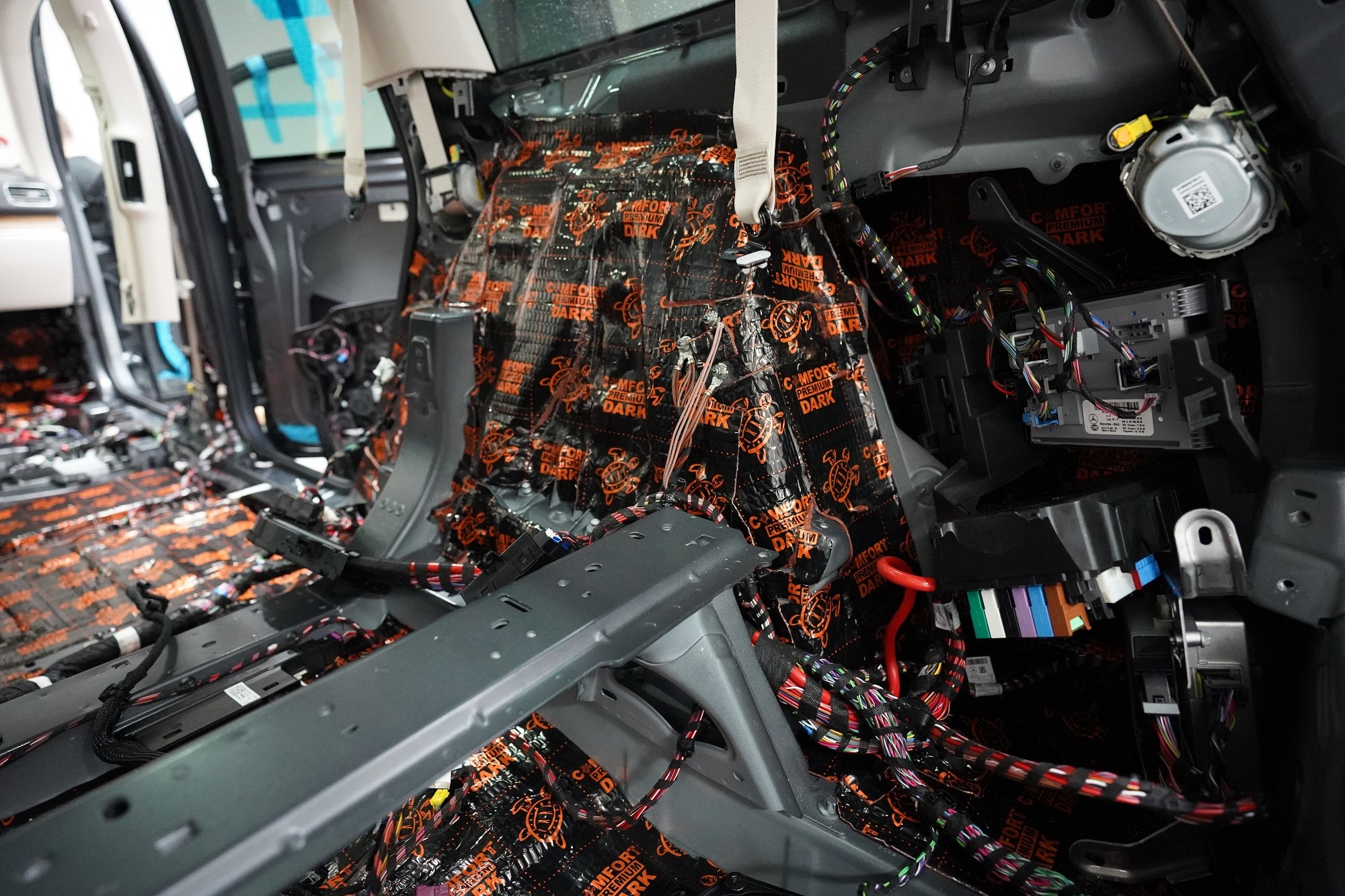 Шумоизолация на луксозния SUV Mercedes-Benz GLS. Този автомобил е пример, че дори толкова скъп автомобил не разполага с достатъчна заводска изолация срещу шум. Собственикът на този красив автомобил вече бе при нас за шумоизолация на Audi Q7, чието фабрично шумоизолиране също не го удовлетворяваше. След инсталацията и свикването с новия по-висок комфорт на своето Audi, не ни изненада, че новият Mercedes-Benz GLS няма да отговори на високите изисквания на неговия собственик по отношение на шумоизолацията и това беше голямо разочарование за иначе безупречния автомобил. Най-големият проблем според собственика беше изразеният шум от пода и от предните и задните колела. Съгласихме се на нашия пакет шумоизолация Premium с индивидуално решение за някои области. Той включва освен покрива, който в този автомобил е панорамен, шумоизолация на всички най-важни области на автомобила. Конкретно шумоизолирахме предни, задни и пета врата, пода, багажното пространство, предни и задни калници и предния капак. Както можете да видите на снимките, защитата срещу вибрации и звукова изолация на купето във вид на пянообразен материал, особено на пода и задните калници, е много недостатъчна и няма шанс да спре шума, особено нискочестотния, който представлява основния проблем при този автомобил. Голям акцент разбира се поставихме върху най-проблематичните области на автомобила и целият автомобил беше шумоизолиран с премиум анти-вибрационни и мембранни материали Comfortmat, които имат най-висока ефективност на съвременния пазар. Поради високата сложност на шумоизолацията при този тип автомобили времето прекарано на автомобила е увеличено с повече от 10 часа в сравнение със стандартните автомобили. Трябва да споменем, че това беше най-сложният за монтаж автомобил, който някога сме имали в сервиза, и също така използвахме най-голямо количество материал, ако изключим товарните автомобили. Въпреки това монтажът успяваме да приключим през 1 работен ден благодарение на присъствието на 4 наши опитни техници.