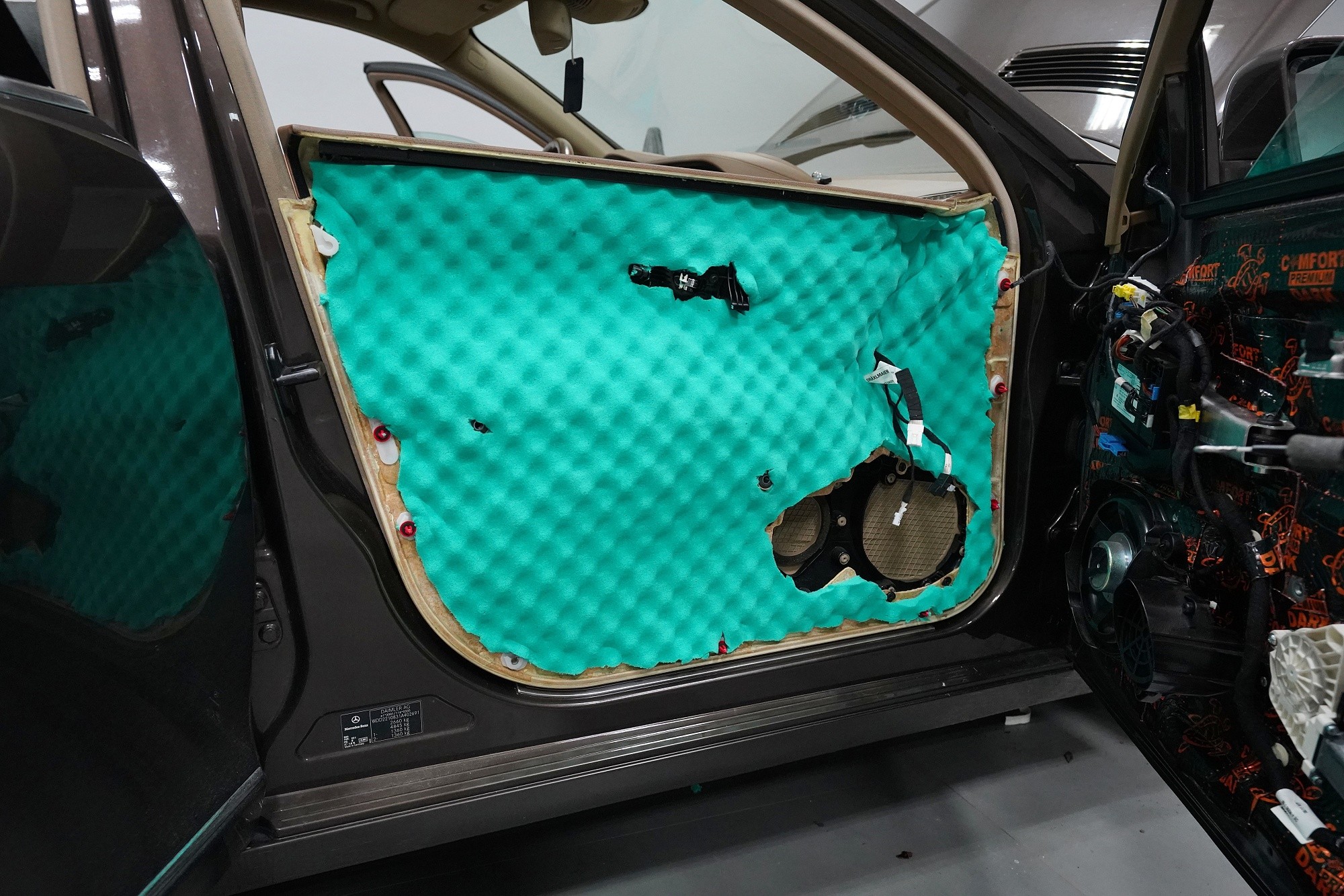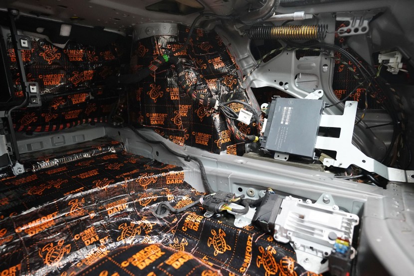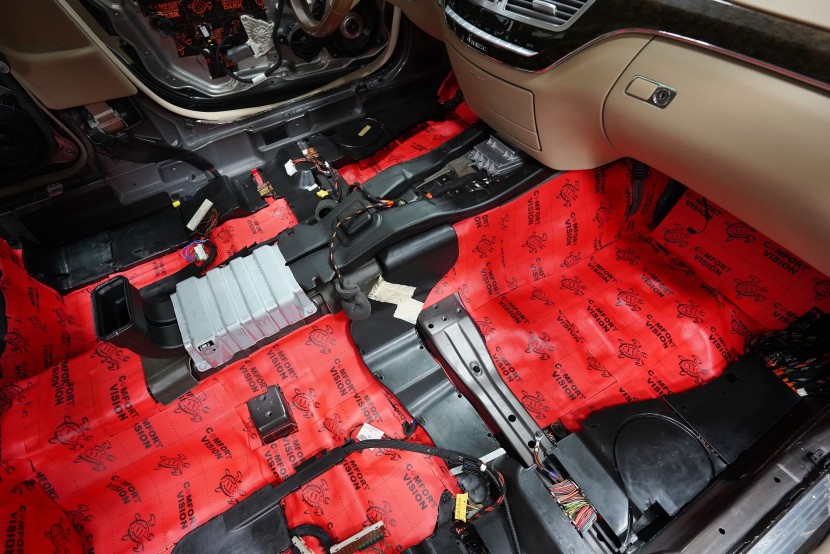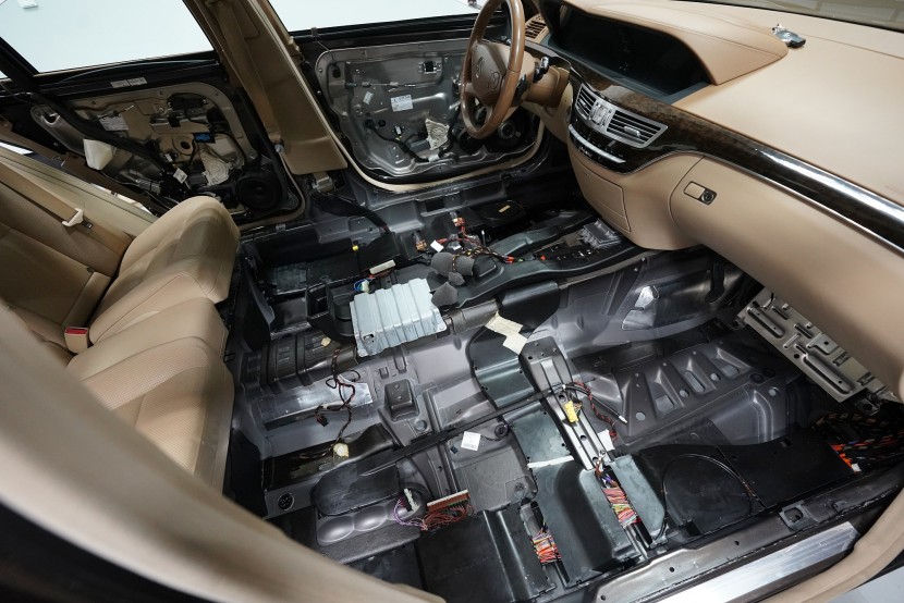 Шумоизолация на луксозен Mercedes-Benz от S-класата. Тази инсталация е типичен пример за това, че дори най-луксозните модели на премиум производителите не разполагат с шумоизолация, която клиентите им очакват. И собственикът на този автомобил не беше доволен главно от шума, идващ от калниците и долната част на автомобила, който се предизвиква в голяма степен от гумите на големите джанти на тази лимузина. Тези проблеми най-добре решава нашият пакет за шумоизолация Premium Plus, който е насочен между другото именно към максимално обезшумяване на пода и предните и задните калници. Конкретно шумоизолираме предните, задните и петите врати, пода, багажното отделение, предните и задните калници от вътрешната страна и капака на двигателя. Този автомобил е много взискателен по отношение на разглобяването и сглобяването на интериора — необходима е максимална прецизност и естествено дългогодишен опит. Поради сложността на шумоизолацията при този тип автомобили времето, прекарано върху автомобила, е увеличено спрямо стандартните коли, въпреки това инсталацията може да бъде извършена в рамките на един работен ден, което е изискване на повечето наши клиенти. Повече информация ще намерите в нашия подробен фоторепортаж.