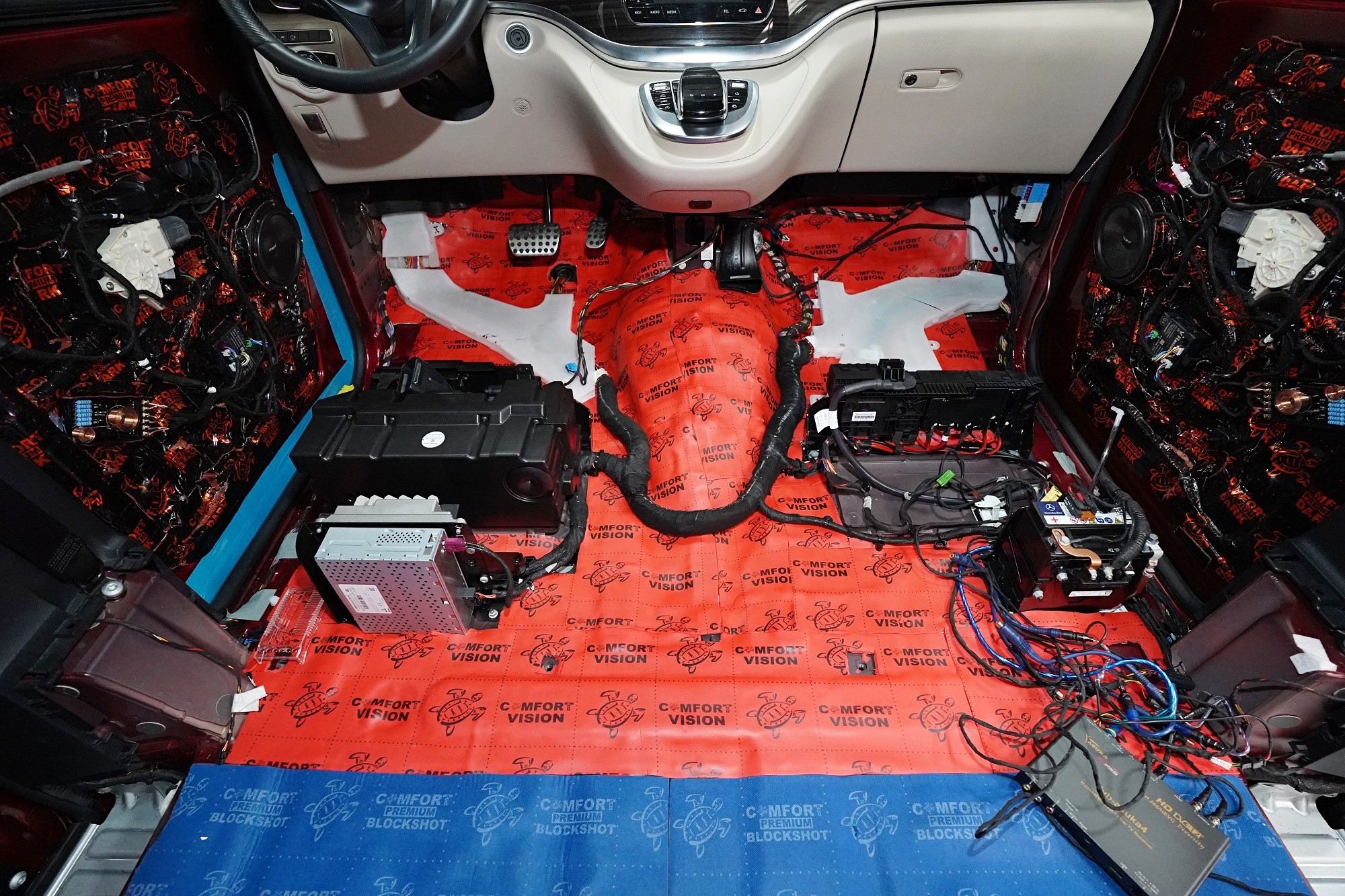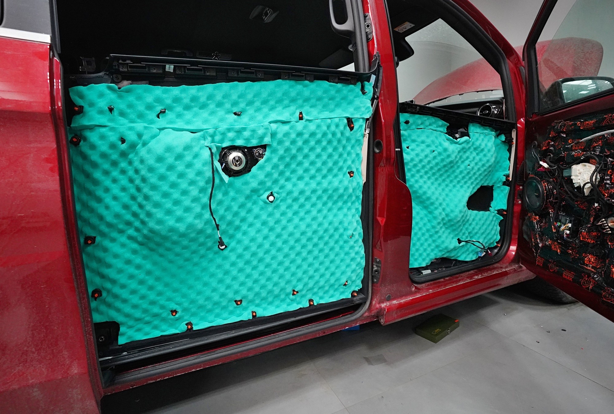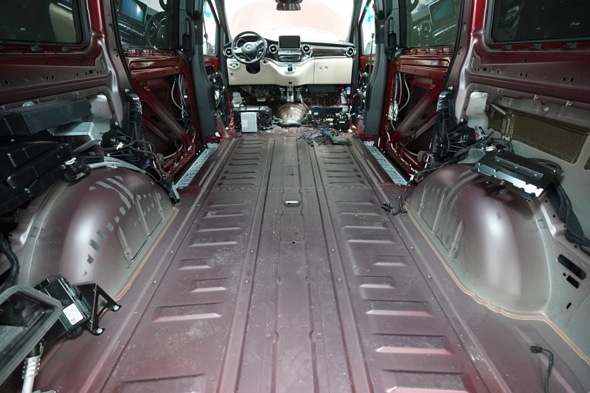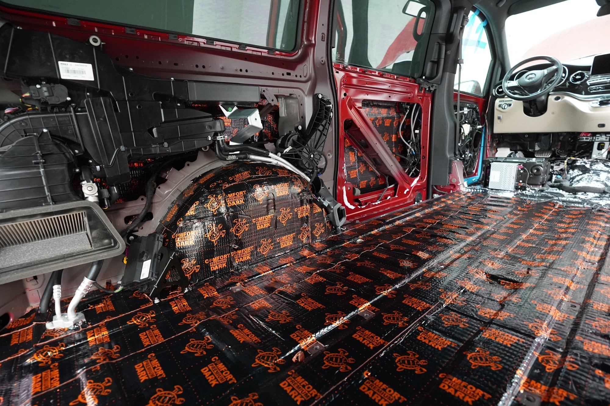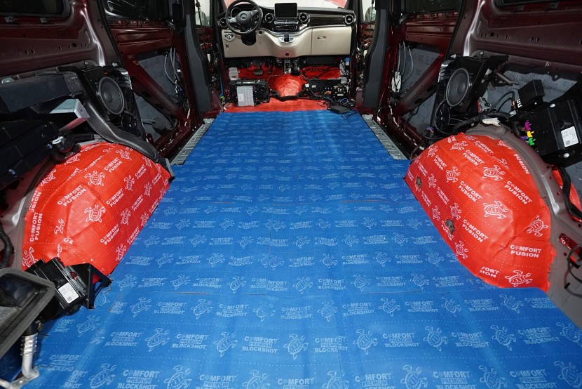 Звукоизолация и озвучаване на премиум MPV Mercedes-Benz V-Class. Този популярен автомобил е традиционен посетител на нашия цех и това основно заради недостатъчната фабрична звукова изолация. Тъй като става въпрос за автомобил от по-висок клас, собствениците очакват висок стандарт и по отношение на фабричната шумоизолация. И често след покупката следва голямо разочарование. Дори при V-Class практически няма напредък в сравнение с други превозни средства от категорията на товарни автомобили и при движение се чува неприятен шум от двигателя, колелата, пътя и аеродинамичен шум. За да отговори популярното "Vе-чко" на параметрите на премиум автомобил, собственикът се обърна към нас да се погрижим за шума в този автомобил. Заедно със собственика избрахме нашия пакет шумоизолация Premium Plus, който освен покрива включва всички важни зони на автомобила. Конкретно се насочихме към предните, плъзгащите се и петите врати, пода, страничните панели, предните и задните калници и капака. Извън пакета шумоизолирахме и таблото, чието обезшумяване има голямо значение при тези автомобили. При пакета Plus избираме по-ефективни и по-дебели материали и автомобилът е шумоизолиран до възможния максимум. При толкова голям автомобил цената на пакета е увеличена, защото сме прекарали повече време на колата и сме използвали по-голямо количество материали. Отделихме внимание и на ново озвучаване, като подменихме високоплатения Burmester система. За съжаление той не разполага с достатъчно качествен звук, но това може да се подобри значително само чрез смяна на говорителите. Избрахме пълен комплект от германския производител Eton, който включва компонентни говорители за предните и задните врати и коаксиални говорители за таблото. Всичко естествено свързахме към фабричния усилвател, който осигурява достатъчна мощност за говорителите. Резултатът от монтажа е не само значително по-качествен звук с детайлни високи честоти и прецизни ниски честоти, но и цялостно тих автомобил с несравнимо по-висок комфорт при шофиране. Такава обширна инсталация вече ни се наложи да разпределим в два работни дни, за да бъде резултатът сто процента.