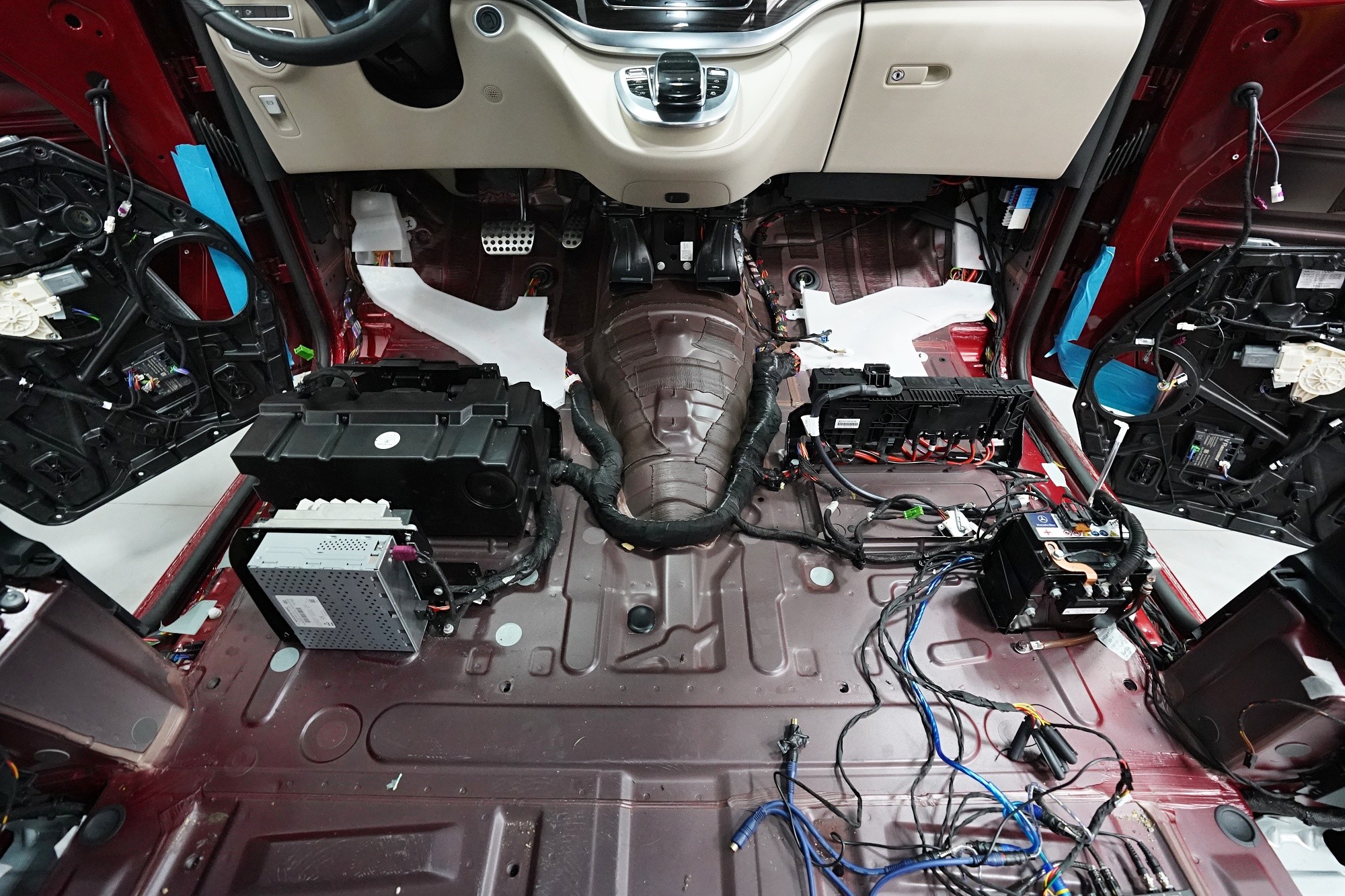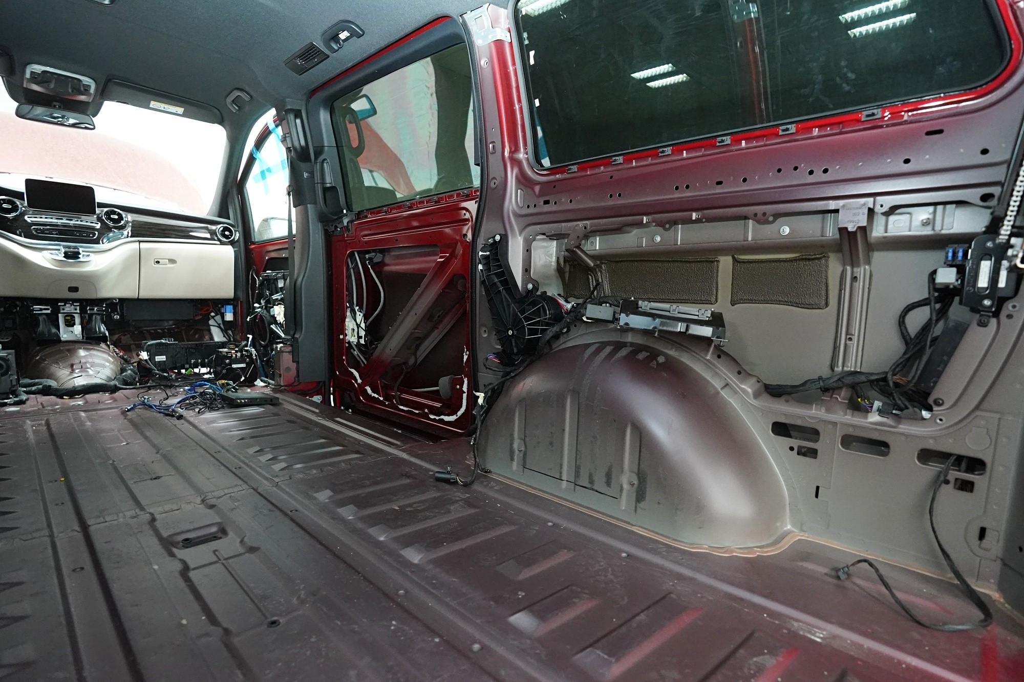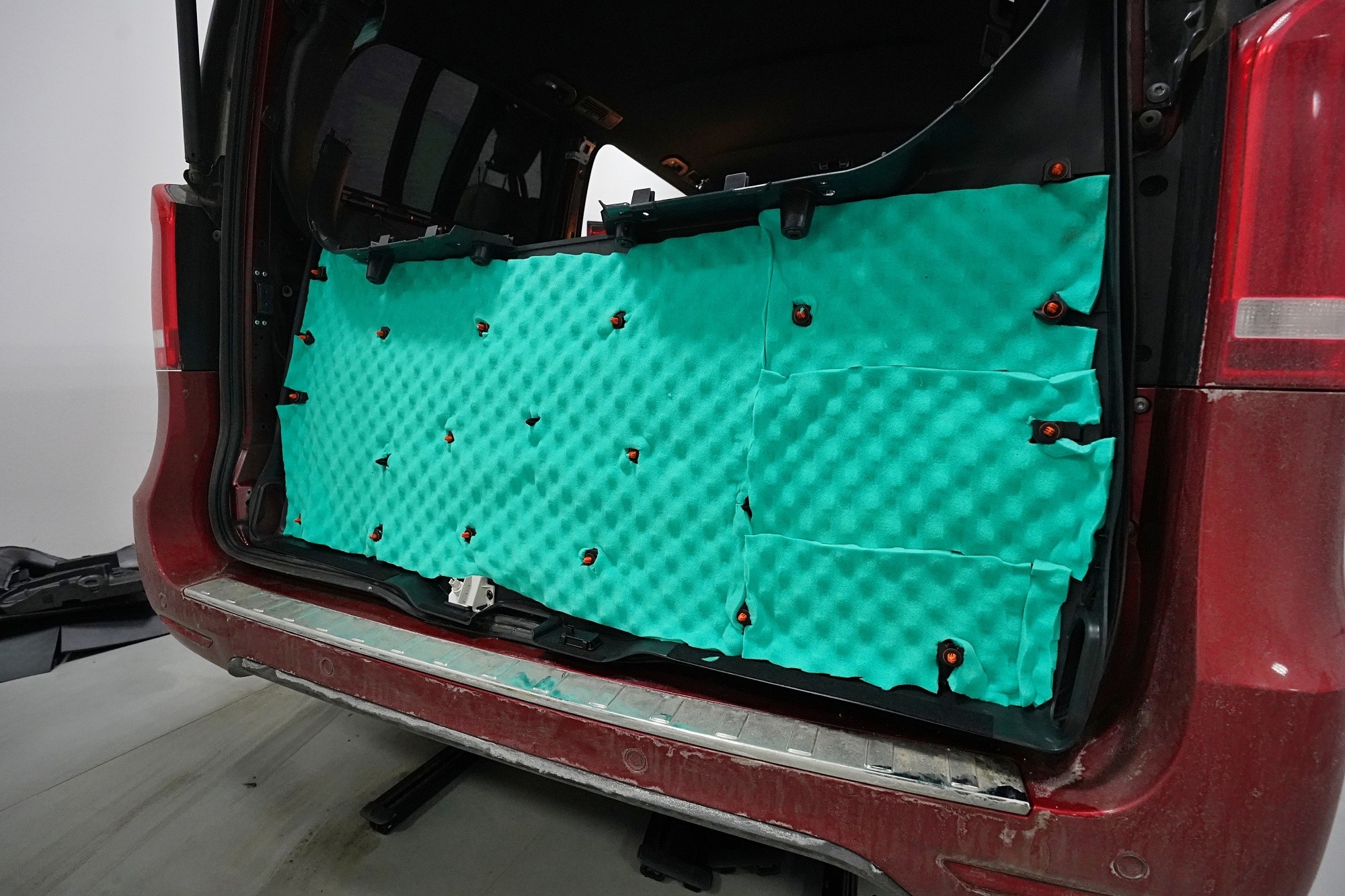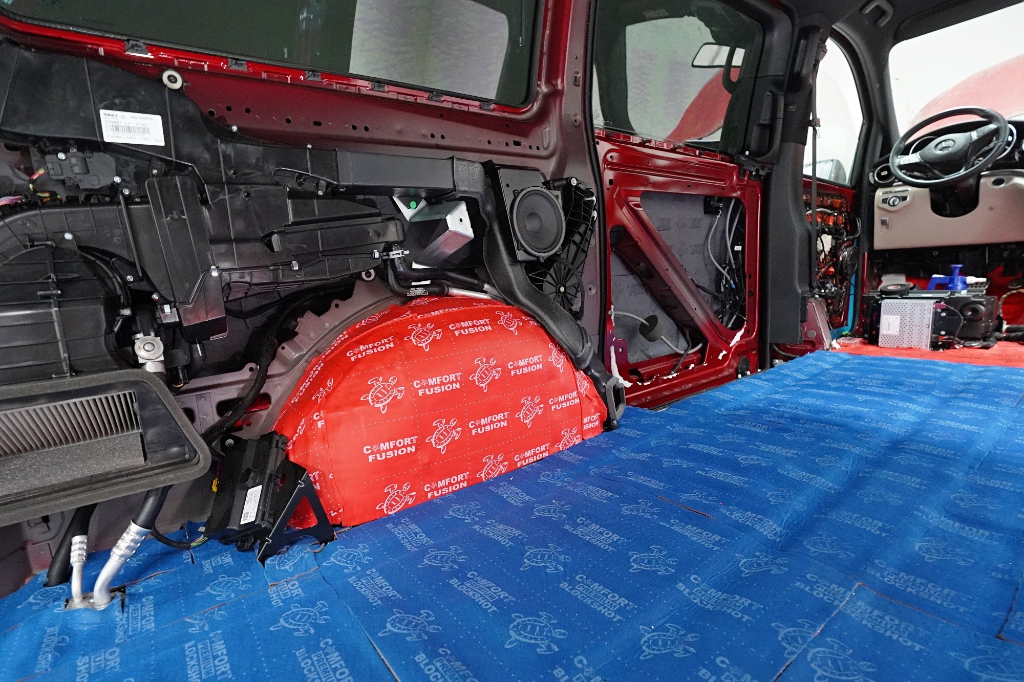 Звукоизолация и озвучаване на премиум MPV Mercedes-Benz V-Class. Този популярен автомобил е традиционен посетител на нашия цех и това основно заради недостатъчната фабрична звукова изолация. Тъй като става въпрос за автомобил от по-висок клас, собствениците очакват висок стандарт и по отношение на фабричната шумоизолация. И често след покупката следва голямо разочарование. Дори при V-Class практически няма напредък в сравнение с други превозни средства от категорията на товарни автомобили и при движение се чува неприятен шум от двигателя, колелата, пътя и аеродинамичен шум. За да отговори популярното "Vе-чко" на параметрите на премиум автомобил, собственикът се обърна към нас да се погрижим за шума в този автомобил. Заедно със собственика избрахме нашия пакет шумоизолация Premium Plus, който освен покрива включва всички важни зони на автомобила. Конкретно се насочихме към предните, плъзгащите се и петите врати, пода, страничните панели, предните и задните калници и капака. Извън пакета шумоизолирахме и таблото, чието обезшумяване има голямо значение при тези автомобили. При пакета Plus избираме по-ефективни и по-дебели материали и автомобилът е шумоизолиран до възможния максимум. При толкова голям автомобил цената на пакета е увеличена, защото сме прекарали повече време на колата и сме използвали по-голямо количество материали. Отделихме внимание и на ново озвучаване, като подменихме високоплатения Burmester система. За съжаление той не разполага с достатъчно качествен звук, но това може да се подобри значително само чрез смяна на говорителите. Избрахме пълен комплект от германския производител Eton, който включва компонентни говорители за предните и задните врати и коаксиални говорители за таблото. Всичко естествено свързахме към фабричния усилвател, който осигурява достатъчна мощност за говорителите. Резултатът от монтажа е не само значително по-качествен звук с детайлни високи честоти и прецизни ниски честоти, но и цялостно тих автомобил с несравнимо по-висок комфорт при шофиране. Такава обширна инсталация вече ни се наложи да разпределим в два работни дни, за да бъде резултатът сто процента.