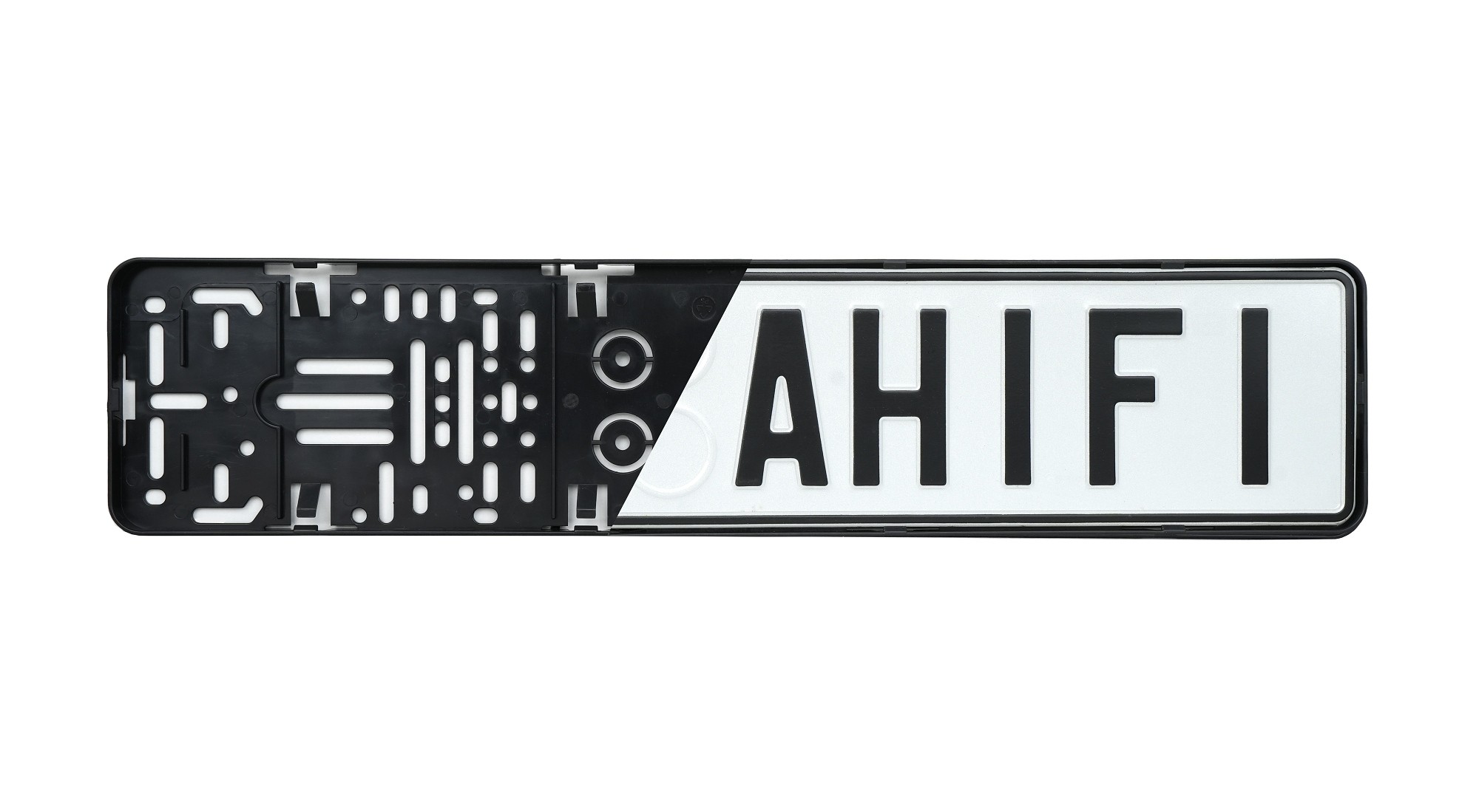 Първо вкарайте табелата в долната страна на пластмасовата рамка, където има 4 щипки. След това вкарайте табелата зад страничните щипки. Накрая щракнете табелата в горните 4 щипки. Трябва постепенно да натискате щипка по щипка. С едната ръка леко повдигнете рамката, а с другата щракнете регистрационната табела. Проверете дали всички щипки са правилно щракнати. Готово.
