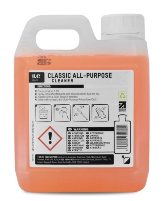 ValetPRO Classic All Purpose Cleaner е отличен универсален почистващ препарат, който е един от най-популярните и най-често използваните при поддръжката на автомобила. Използва се върху пластмаси в интериора, за почистване на петна по тапицерии и др. Разтваря мръсотията, която след това се почиства лесно, премахва нечистотиите от пластмасови повърхности и др. Classic All Purpose Cleaner осигурява отлични резултати на достъпна цена. Отличен при употреба както в интериора, така и в екстериора на автомобила.