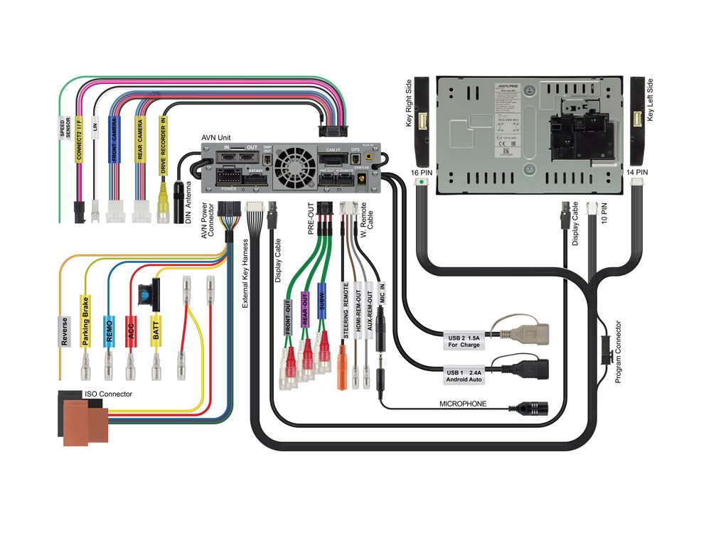 | Кабел с ISO конектор в комплектаОтзад на самото тяло на автомобилното радио обикновено се намира специфичен 12–18-пинов конектор, към който се включва преход към стандартното ISO. Този кабел винаги е част от опаковката при марково следпродажбено (aftermarket) автомобилно радио и е с дължина 8–15 см. | Да |