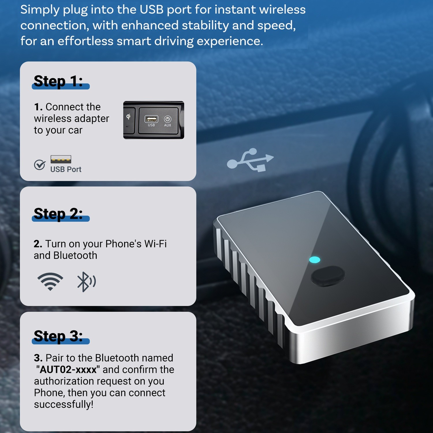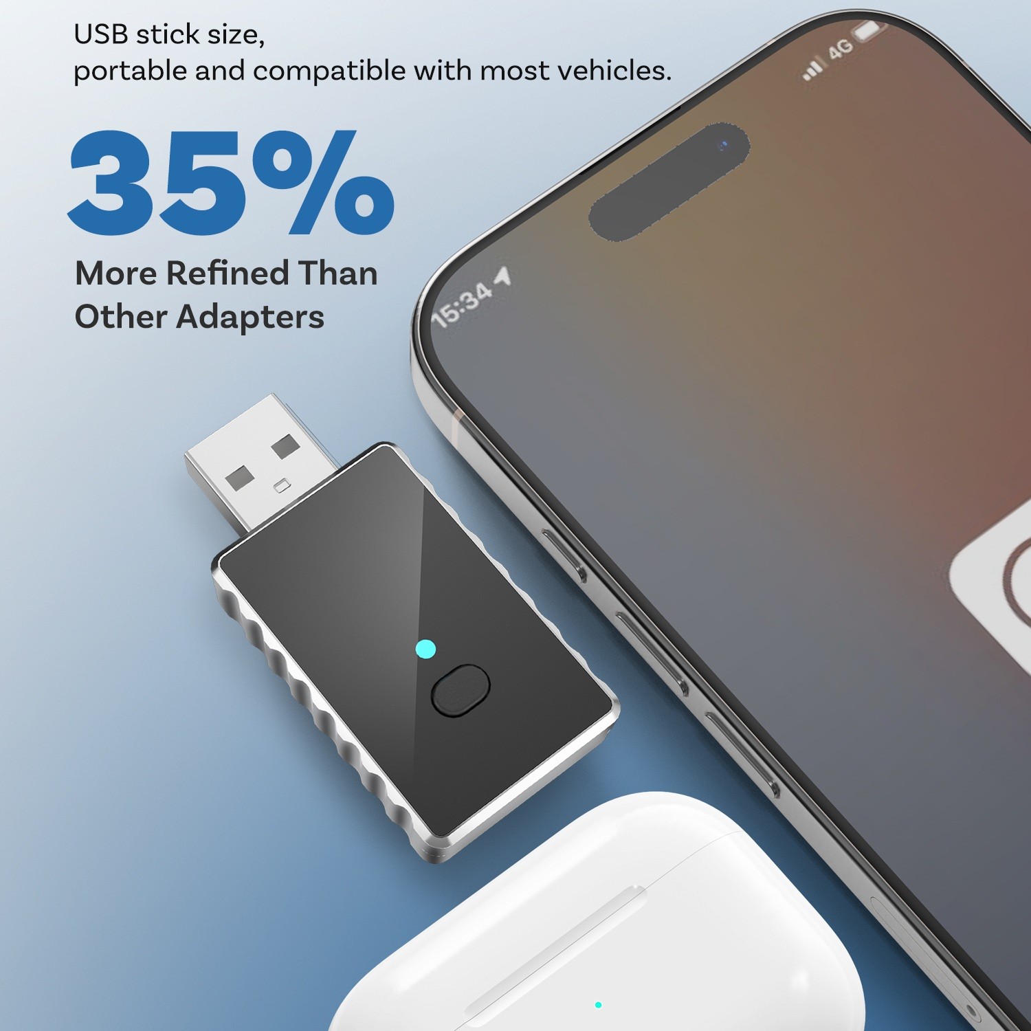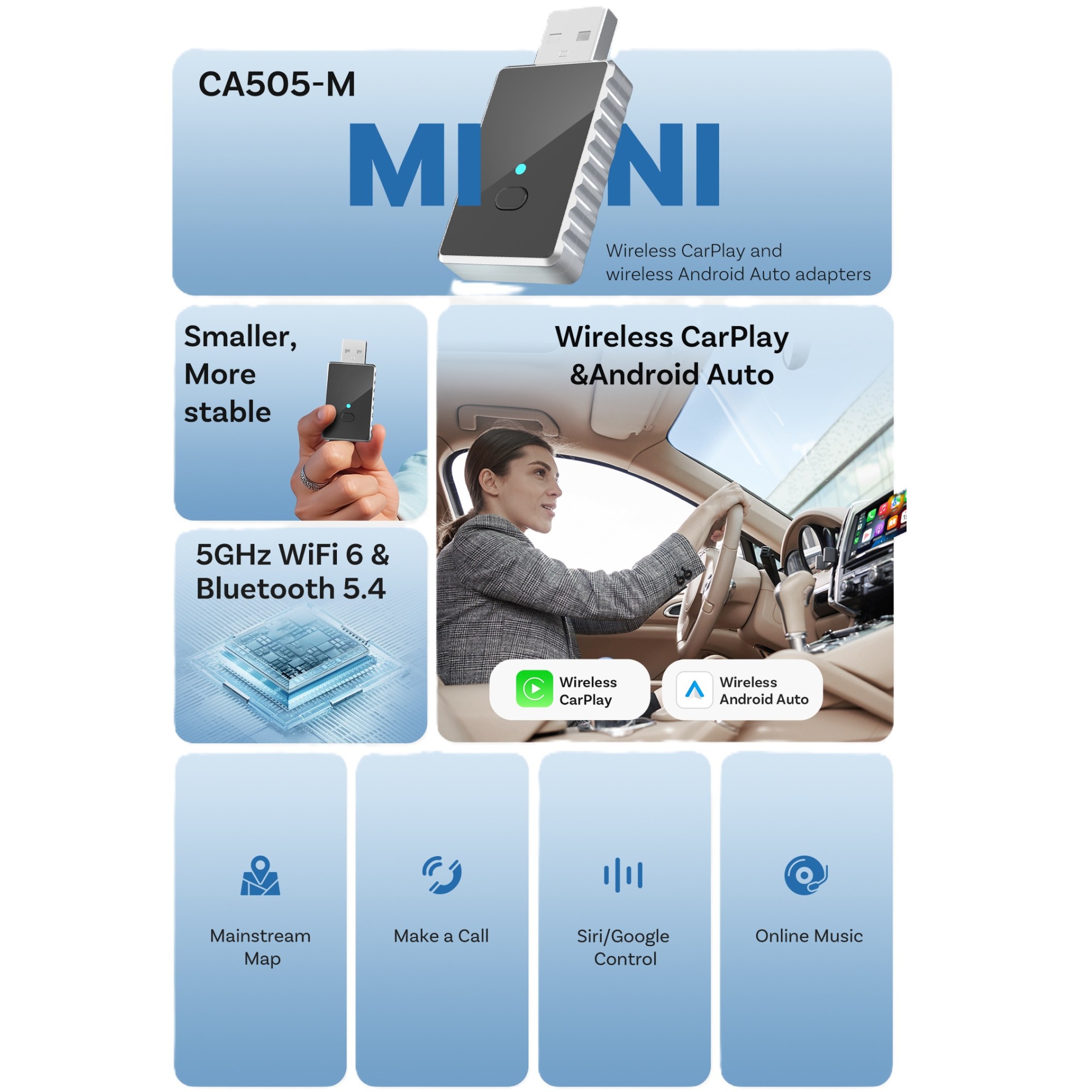 CA505 Mini е компактен модул за кола, който преобразува оригиналния кабелен Apple CarPlay и Android Auto в удобно безжично свързване. Предназначен е за автомобили с оригинална единица, която поддържа CarPlay или Android Auto чрез кабел и осигурява по-голям комфорт при ежедневна употреба. След първоначално сдвояване чрез Bluetooth телефонът се свързва автоматично при пускане на запалването, така че отпада нуждата от постоянно включване на телефона в USB порта.