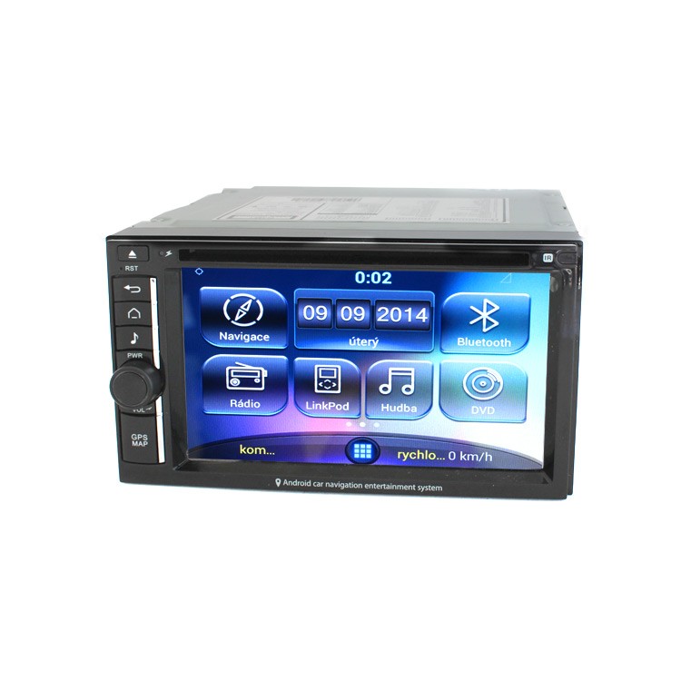 Универсално мултимедийно радио с 6,2" сензорен дисплей и система Android 4.1. 2-DIN авторедио е оборудвано с GPS навигация AUTOMAPA с карти на цяла Европа, Bluetooth handsfree комплект, DVD плейър, вграден WiFi модул, 2 USB порта, ускорен старт при включване на автомобила (до 2 секунди) и редица други функции.