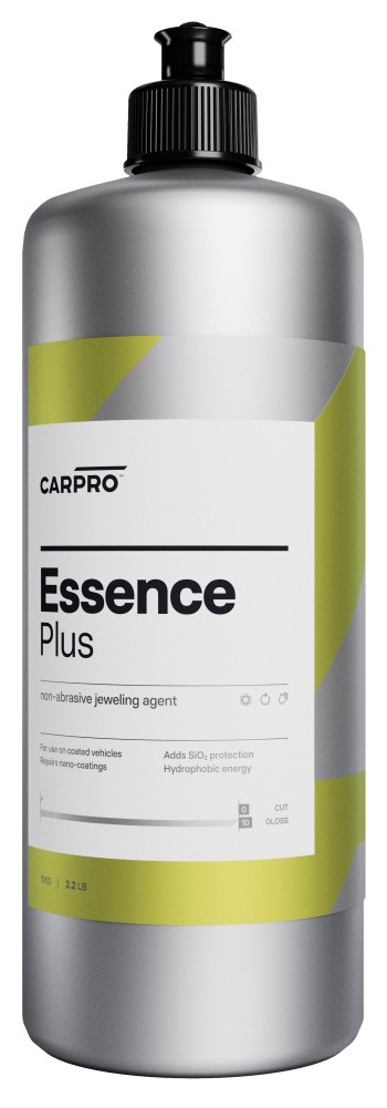 CarPro Essence Plus е революционна полираща паста със съдържание на SiO2 предназначена за ремонт на керамични повърхности, повредени от различни влияния. Досега при нужда керамичното защитно покритие на лака трябваше да се шлайфа и нанася отново. Това вече не е необходимо! Достатъчно е да се преполира повърхността с неабразивната паста Essence Plus и повърхността се освобождава от драскотини, запълва износени или повредени места, премахва ивици след неправилно нанасяне и керамичната защита възвръща първоначалните си хидрофобни и защитни свойства! CarPro Essence Plus придава на повърхността най-високия блясък и допълнителен слой SiO2, който удължава живота на защитата за още един година. Нанася се ръчно или машинно чрез просто преполиране (като течен восък). Свойствата на този супеp продукт и изключителната му адхезия към повърхността позволяват използването му дори върху незащитен лак в случаи, когато корекцията на дефекти с абразивна паста не е възможна. CarPro Essence Plus дълбоко почиства лака, прикрива драскотини и оставя гладък и високогланцов керамичен слой, който дълготрайно отблъсква вода и мръсотия. Подходящ и за фолиа, хром и стъкло.Основни характеристики