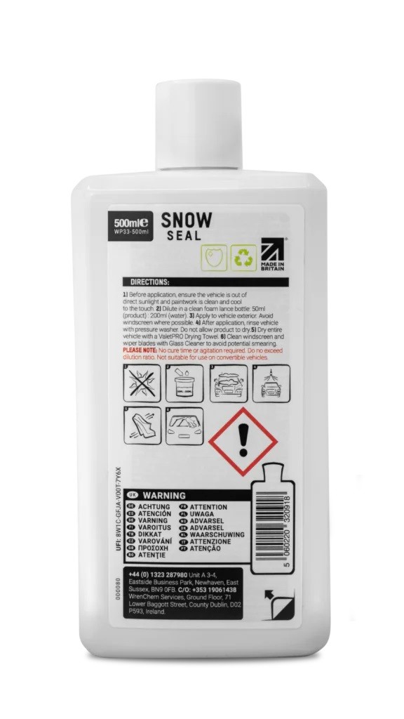 ValetPRO Snow Seal е специално разработено защитно покритие за употреба с приставка за пяна и водоструйка. Snow Seal „покрива“ автомобила ви с издръжливо хидрофобно покритие, което води до желания и популярен ефект на капене. Snow Seal също така оставя впечатляващо лъскаво покритие на боята. Нанасянето не може да бъде по-лесно - просто напръскайте върху чист автомобил в препоръчителното разреждане, изплакнете и след това подсушете.