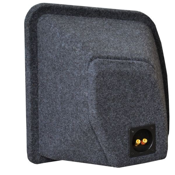- Ozvučnice je potažená šedým kobercem a osazená terminálem pro připojení kabeláže. \n