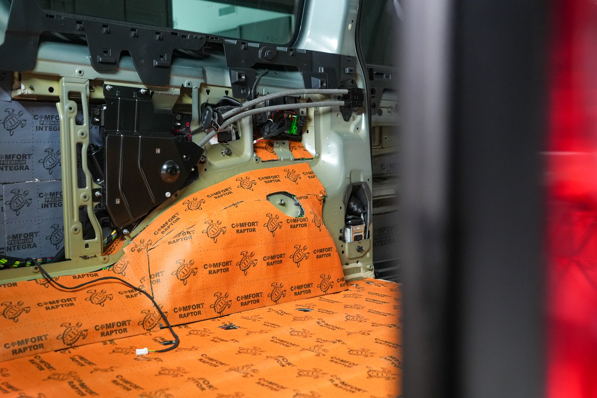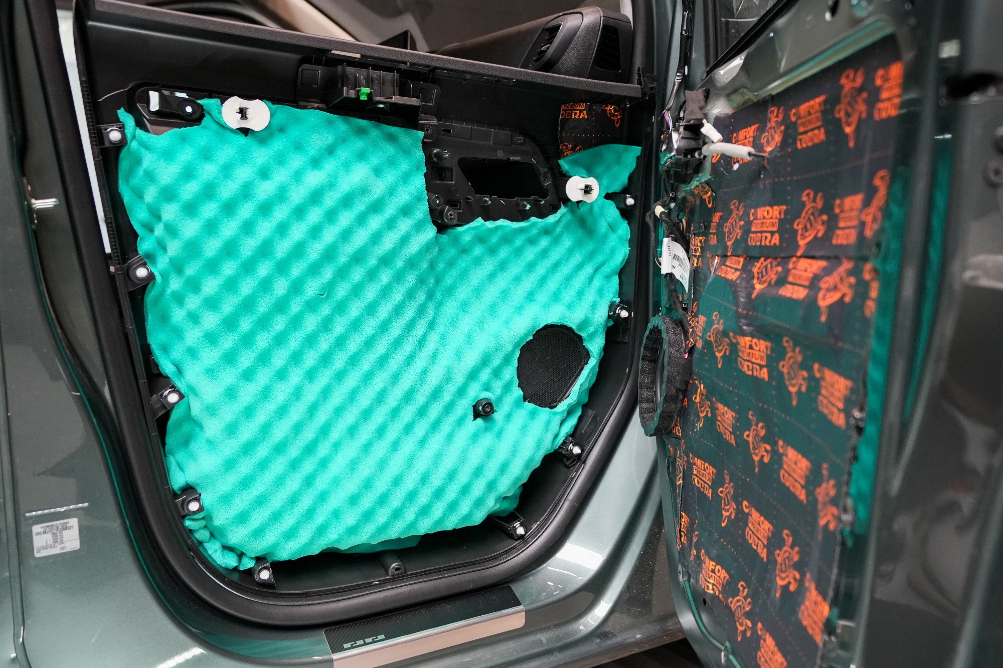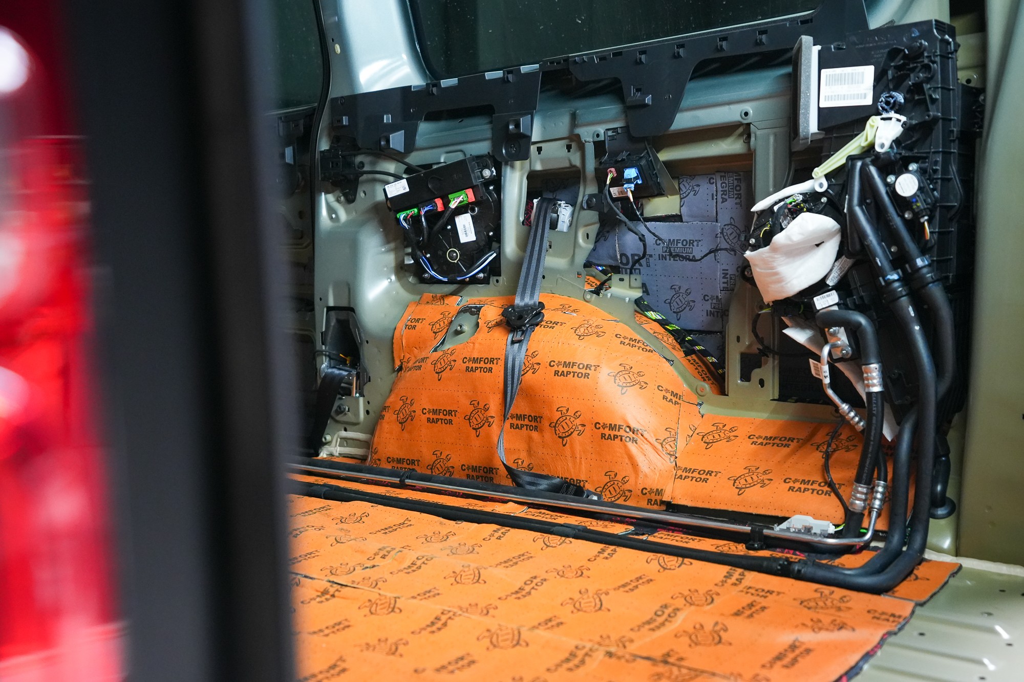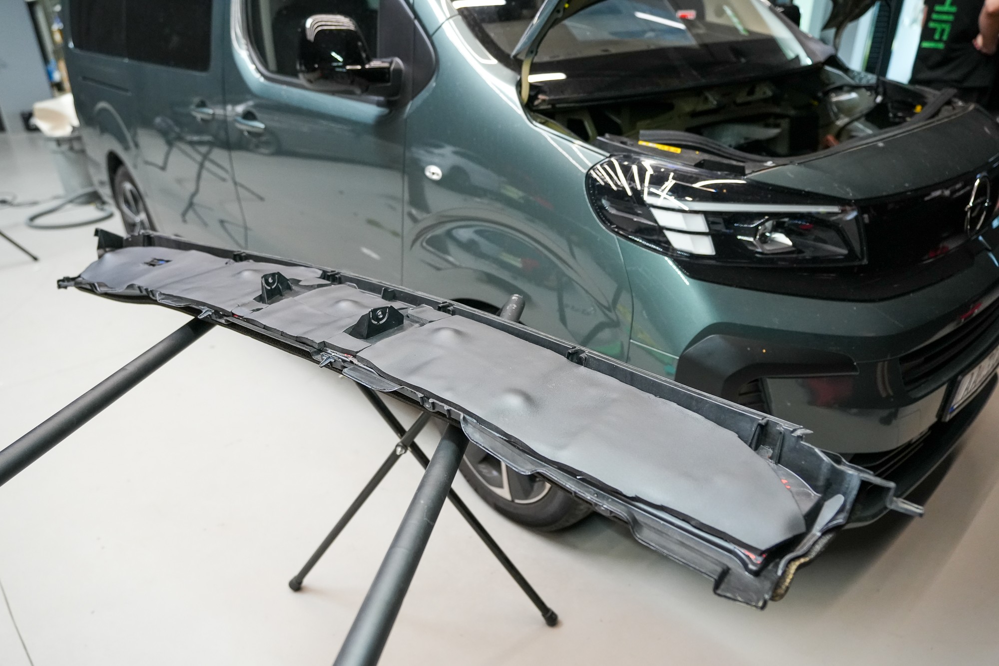 Нашата цел беше да превърнем шумния интериор на Zafira в комфортна среда, в която пътниците да се наслаждават на тишина и спокойствие. Това означаваше щателно обезшумяване на всички проблемни зони на купето. Използвахме за това премиум шумоизолационни материали Comfortmat, които нанесохме поне в два слоя на всички ключови части – от предните, плъзгащите и задните врати, през пода, страничните панели, калниците, таблото до предния капак. Не забравихме и пластмасовите детайли в интериора, които също предават шум.