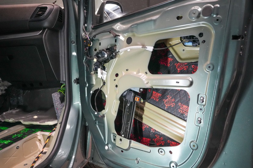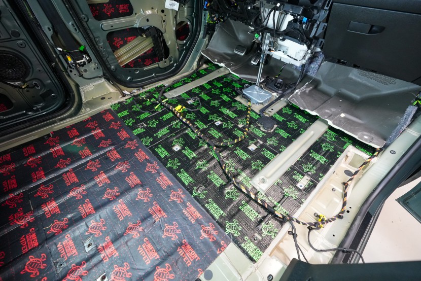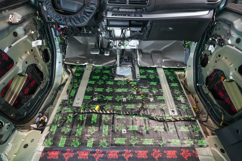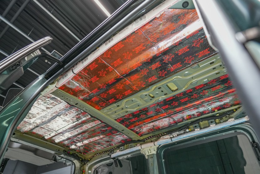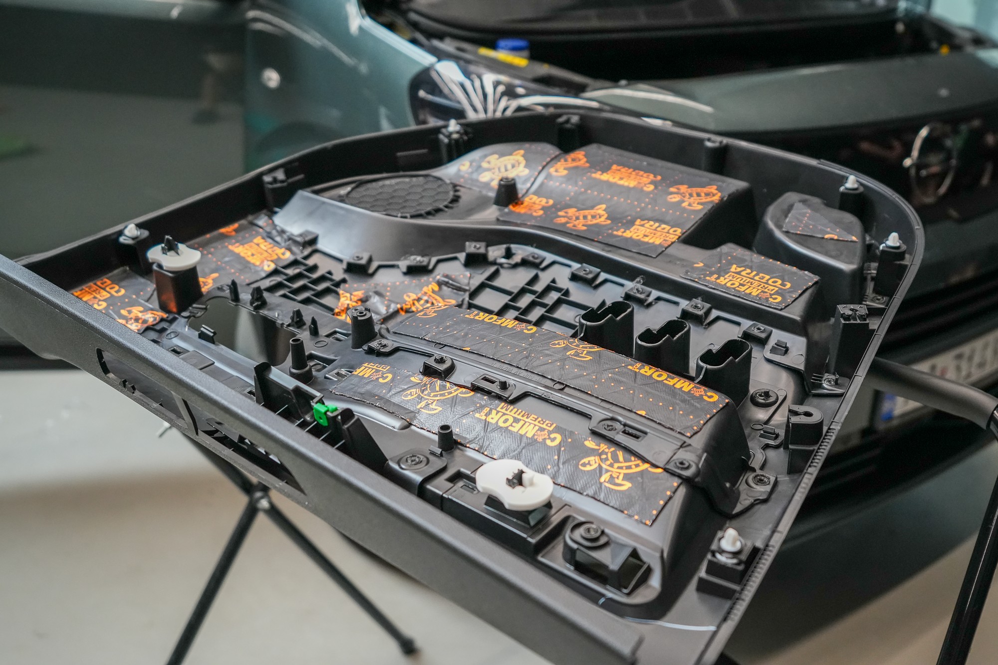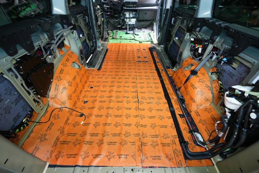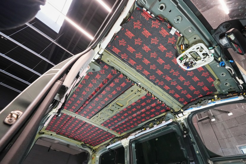 За този конкретен автомобил избрахме нашия разширен пакет Premium Plus, който в сравнение с пакета Expert е подобрен с по-дебели и по-ефективни шумоизолационни материали. Благодарение на това обезшумяването е наистина на възможно максимално ниво. Понеже става въпрос за голямо MPV, разходът на материали и времевата натовареност бяха по-високи, така че по поръчката едновременно работеха четирима наши техници. Въпреки това успяхме да завършим всичко в рамките на един работен ден.