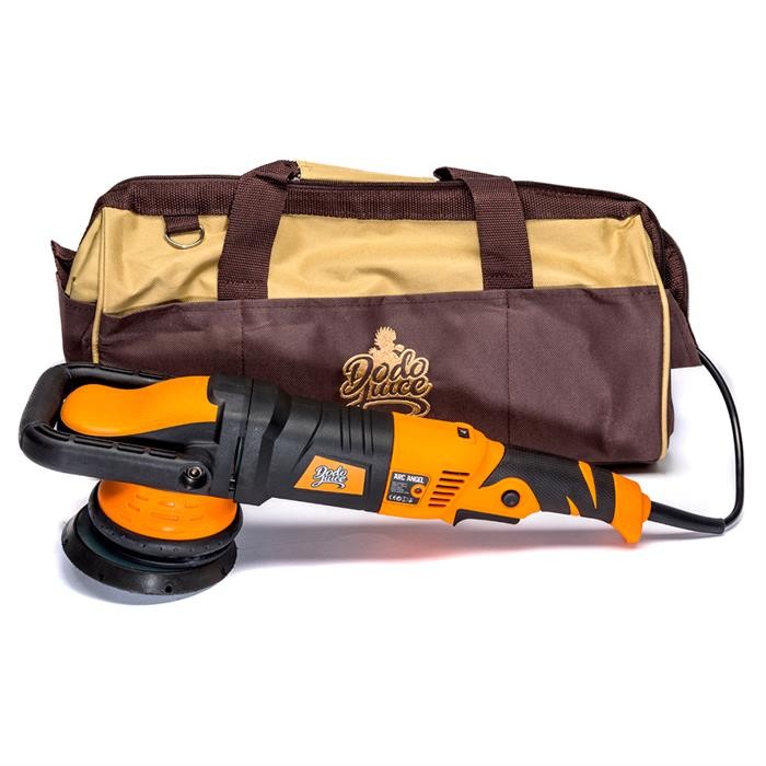 Ръчното отстраняване на кръгови драскотини може да бъде тежка, отнемаща време работа и често да доведе до противоречиви резултати. Решението е машинна полираща машина. Понеже полиращата глава извършва орбитално движение, вероятността от нежелано повреждане на лака е по-малка. Тази тясна орбитална полираща машина Dodo Juice Arc Angel с мощност 900 W се доставя с мека защитна капачка на скоростната кутия, вентилирана опорна плоча 125 mm, кабел с дължина над 6 m, D-дръжка и резервни въглени за мотора. В комплекта е включена и презрамка-чанта Dodo Juice с бродерия в модерен кафяв цвят.