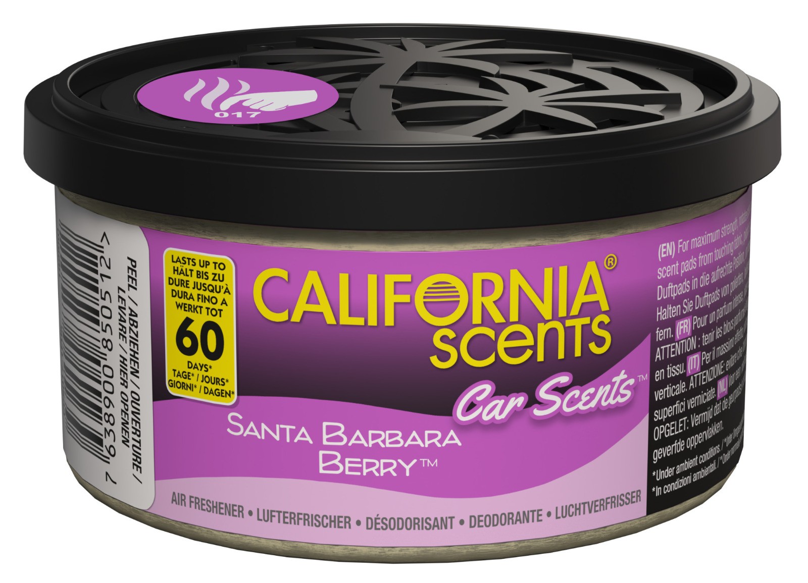 Оставете се да ви отведат в калифорнийски гори, пълни със сочни плодове! California Scents Santa Barbara Berry носи интензивен аромат на смес от горски плодове - боровинки, малини и къпини, който освежава всеки интериор и създава приятна атмосфера. Отличен избор за любителите на плодови аромати с деликатна сладка нотка.
