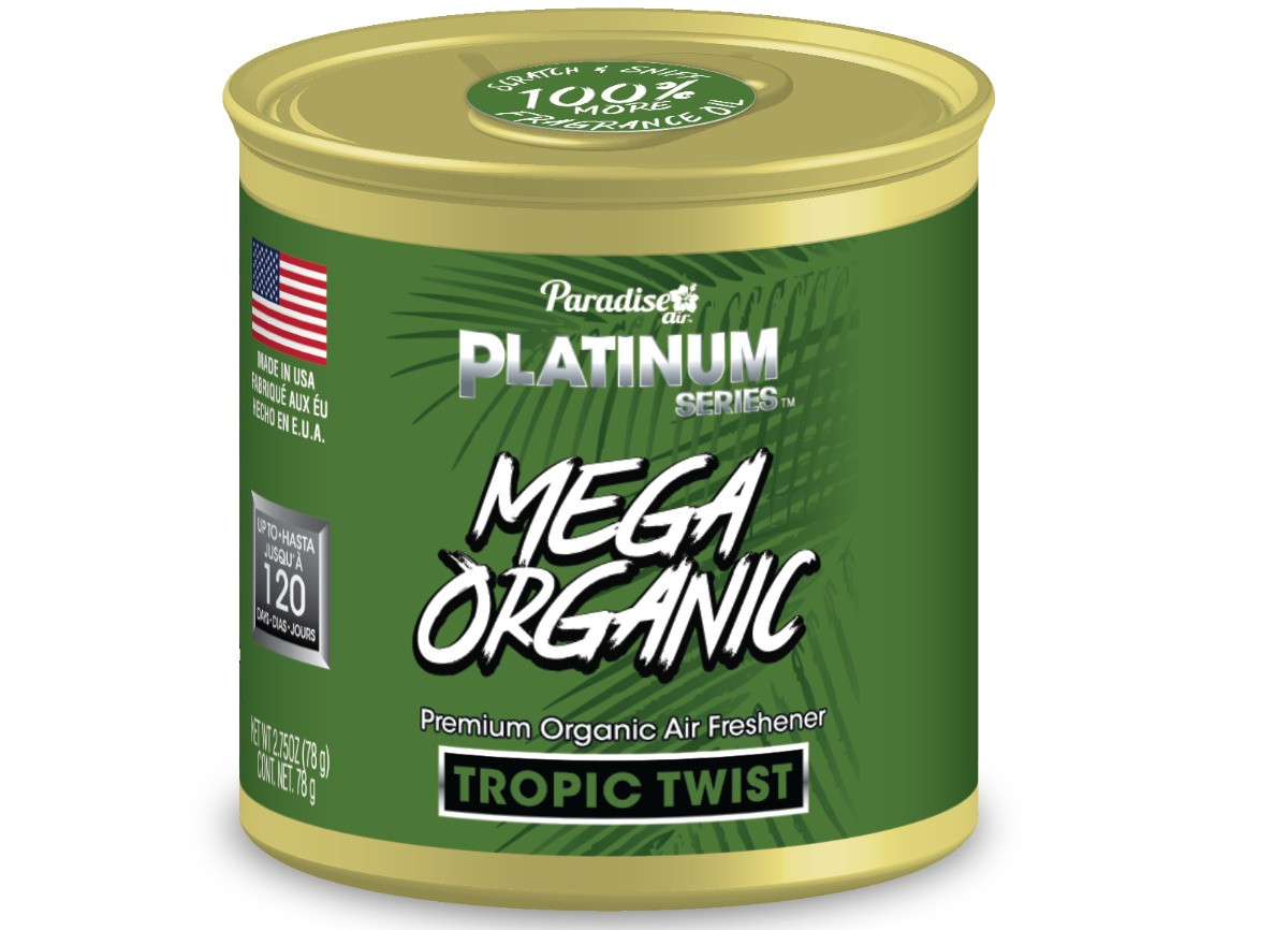 Освежител за въздух в метална кутия Paradise Air Mega Organic Air Freshener Tropic Twist - Тропически бризParadise Air Organic Tropic Twist носи освежаваща комбинация от екзотични плодове и цветя, която ще ви пренесе в слънчеви и тропически краища. Този натурален освежител за въздух е произведен от екологични материали с етерични масла, които освобождават аромат до 120 дни.Основни характеристикиАромат: тропически бриз - сладък, свеж и цветисто-плодов.Тегло: 78 г.Състав: 100% натурален, биоразградим носител с етерични масла.Употреба: автомобил, домакинство, офис, гардероб, тоалетна и др.Трайност: до 120 дни аромат (в зависимост от средата).Практична опаковка: метална кутия с регулиране на интензитета на освобождаване на аромата.Made in USA.Инструкции за употребаОтворете капачката.Поставете в желаното пространство.Наслаждавайте се на прекрасния аромат до два месеца.Интензитетът на аромата може да се регулира чрез завъртане на капачката.За маркатаParadise Air е премиум марка освежители за въздух, която носи в интериора уникални аромати от екзотични дестинации. С широко предложение от ароматни варианти, вдъхновени от тропически райове, Paradise Air предлага не само приятен аромат, но и дълготраен ефект, който подобрява атмосферата в автомобила, дома и офиса. Тези освежители за въздух са проектирани да комбинират качествени ароматни есенции с модерен дизайн и затова са предпочитан избор сред любителите на чиста и ароматна среда. В асортимента на Paradise Air ще намерите висящи освежители, спрейове и гелови варианти в метални кутии, които са идеални за бързо и ефективно ароматизиране на всяко пространство. Марката залага на интензитета на аромата, трайността и оригиналното изпълнение. Благодарение на това Paradise Air печели все повече клиенти, търсещи качествени и стилни освежители за въздух. Открийте света на ароматите Paradise Air и се пренесете в тропически рай по всяко време - просто изберете своя любим аромат!