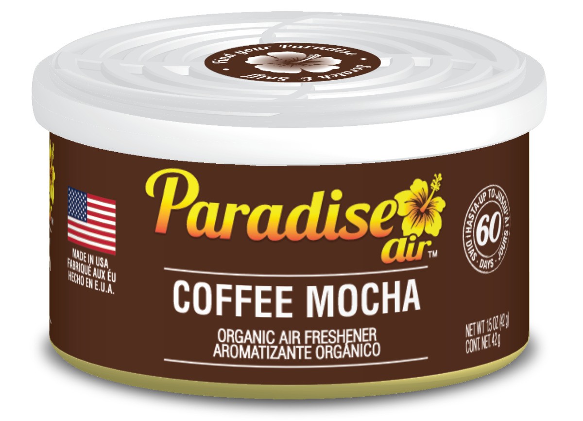 Paradise Air Organic Coffee Mocha носи богат и топъл аромат на прясно приготвено кафе, съчетан с нежни нотки шоколад. Този натурален освежител за въздух е произведен от екологични суровини и етерични масла, които осигуряват до 60 дни дълготраен и приятен аромат.
