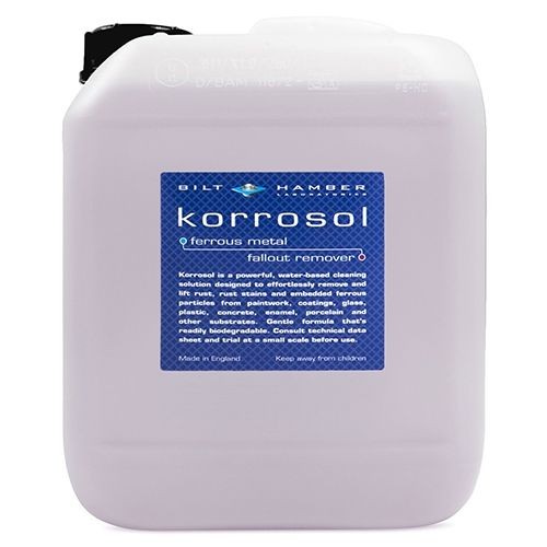 Bilt Hamber Korrosol е неалкален отстранявач на полепнала ръжда с балансирано pH, който работи деликатно и ефективно при премахване на полепналата ръжда, която се отлага по повечето автомобили. Тези много вредни замърсявания обикновено не се виждат с просто око. Когато следващия път миете колата, опитайте да прокарате ръка леко по лака и да огледате каросерията от по-близо. На хоризонталните панели, като капака, покрива или багажника, може да усетите лека грапавост под пръстите. Може да си мислите, че това е само прах от въздуха, но не е така. Въздушните метални частици, които се образуват при спиране на автомобила пред вас, се утаяват плътно върху лака на колата и постепенно тези частици корозират повърхността на лака, като така лакът се уврежда и разрушава необратимо.Основни характеристики