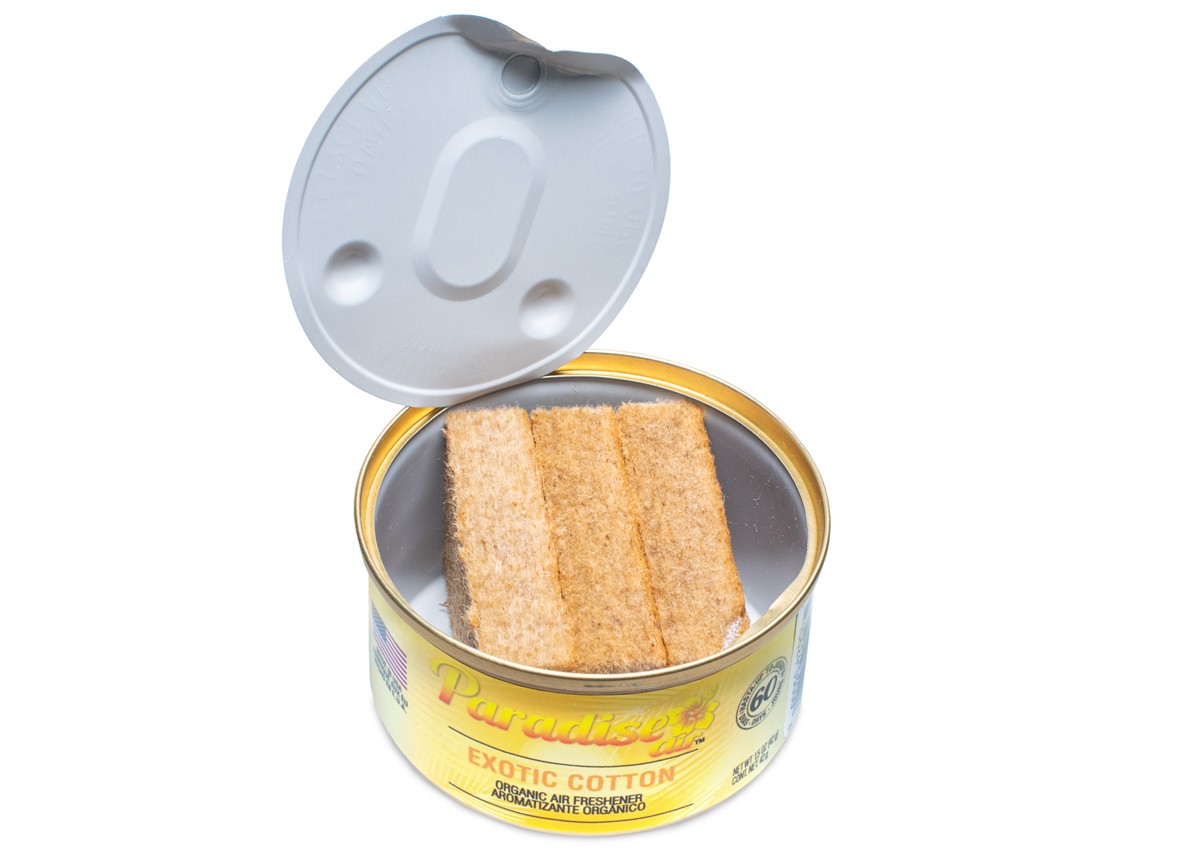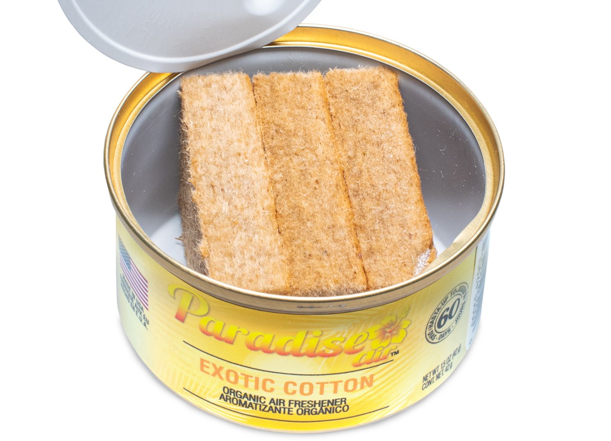 - Всяка метална кутийка аромат Paradise Air Organic съдържа три блока пресован лен, напоен с парфюм.