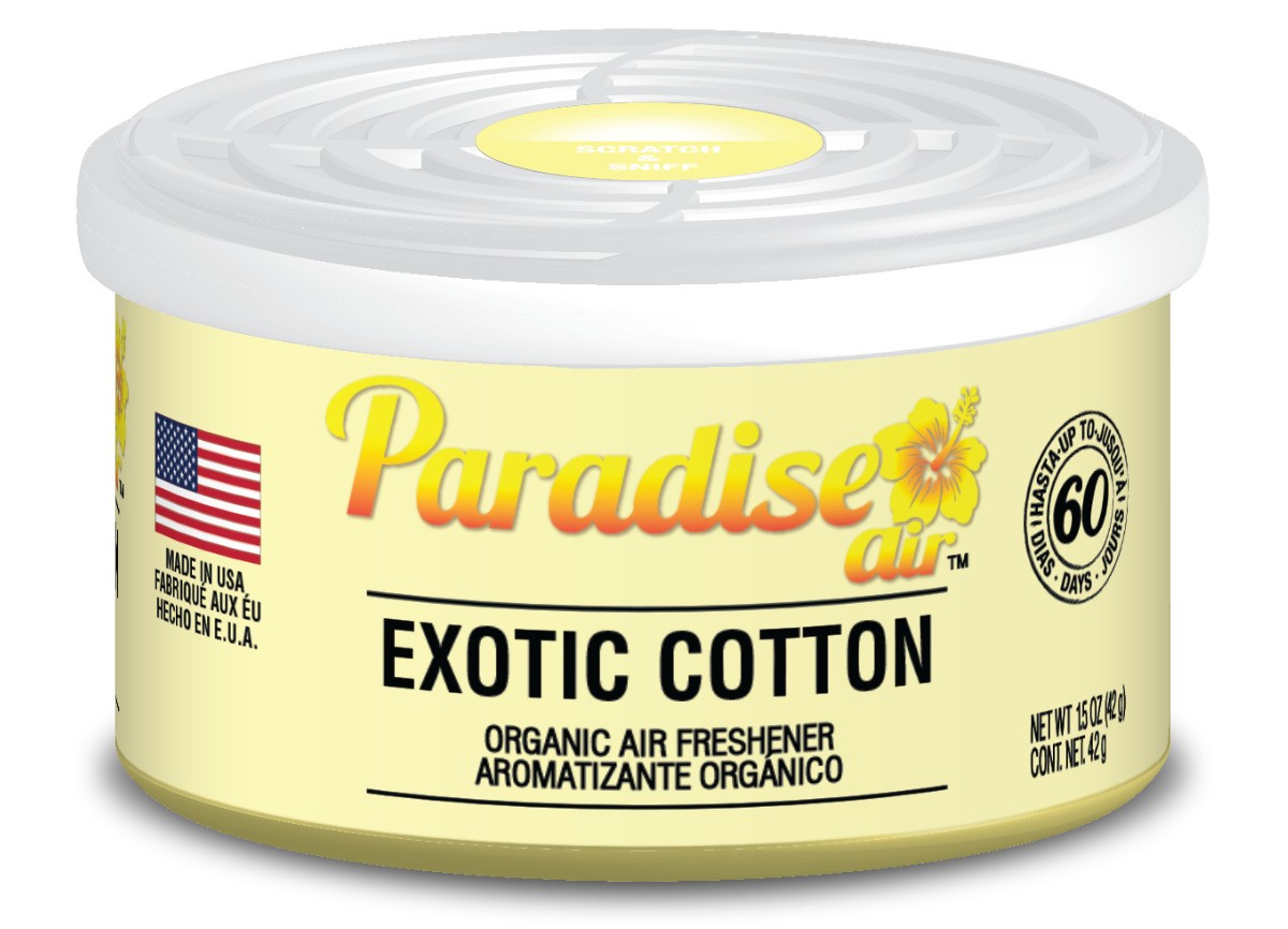 Paradise Air Organic Exotic Cotton предлага природен и същевременно луксозен аромат, който съчетава свежестта на чист памук с леки цветни и екзотични нюанси. Този освежител за въздух е произведен от екологични съставки и ароматни етерични масла, които отделят приятен аромат до 60 дни.