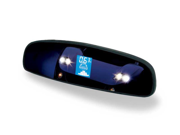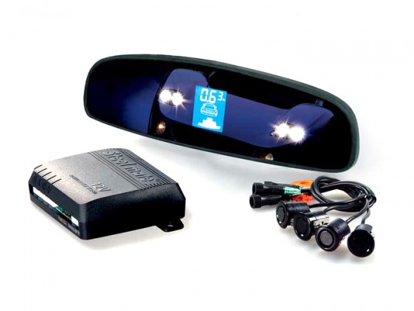 Паркинг асистент STEELMATE с 4 сензори и LCD дисплей вграден вътре във вътрешното ретровизорно огледало с акустична и гласова сигнализация предназначен за монтаж в задната броня на автомобила.