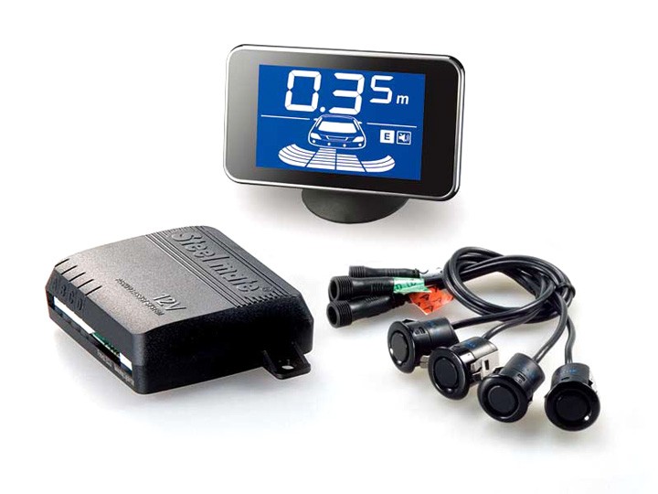 Parkovací asistent STEELMATE se 4 snímači a LCD displejem V6 s akustickou a hlasovou signalizací určený pro instalaci do zadního nárazníku vozidla.