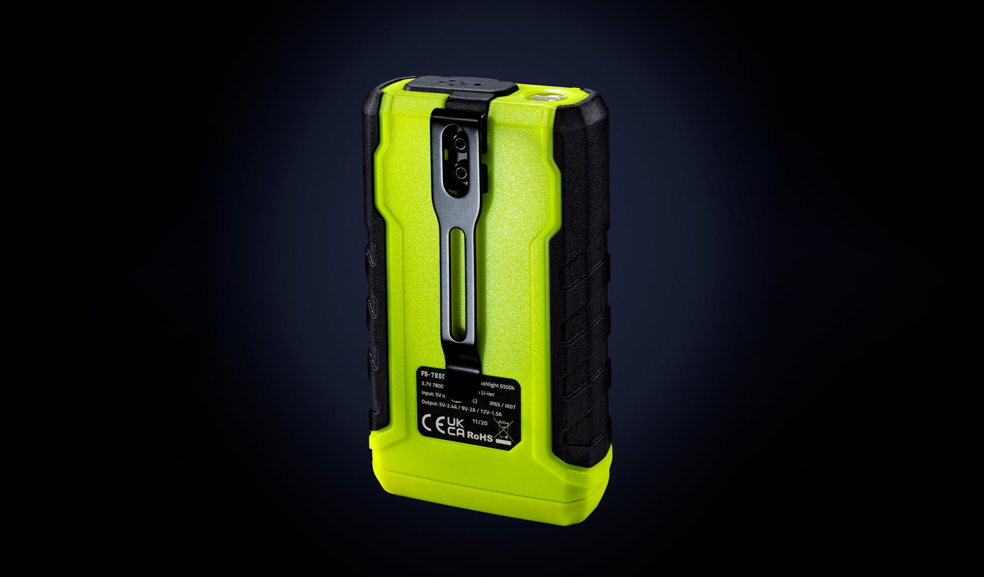 PB-7800 е практична 250-луменова SMD LED фенерна светлина с висококапацитетна 7800 mAh Li-ion пауърбанк. Тялото е от здрав найлон и TPR. Напълно устойчива външна обвивка, защита срещу прах и вода IP65, удароустойчивост IK07 и устойчивост при падане от височина до 2 m. Неговата адаптивна батерия предлага няколко изхода 5V 2,4A / 9V 2A / 12V 1,5A и също така защита срещу презареждане, претоварване, дълбоко разреждане и късо съединение. Силната магнитна основа и здравата джобна щипка осигуряват максимални възможности за използване.
