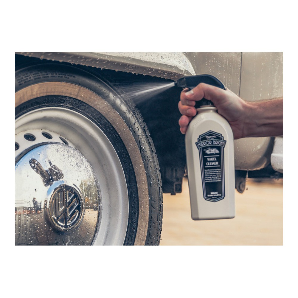 Meguiar's Mirror Bright™ Wheel Cleaner е надеждно решение за почистване на всички видове джанти. Препарат с неутрално pH и специални добавки, който разтваря спирачен прах и остатъци от ръжда интензивно, но щадящо. Идеален за почистване на хромирани, алуминиеви, полиранни, лакирани и мотоциклетни джанти. Meguiar's Mirror Bright е най-универсалният почистващ препарат за джанти. Неговата специална формула е ефективна и в същото време 100% щадяща за всички типове джанти. Благодарение на специалната си формула той ви показва колко замърсени всъщност са джантите - при контакт с желязосъдържащо замърсяване повърхността леко посинява до лилаво. Колкото повече контаминанти с желязо (напр. плаваща ръжда, спирачен прах и т.н.), толкова по-интензивно е оцветяването. Почиствящите добавки остават по повърхността на джантите и освобождават замърсяванията, които след това лесно можете да изплакнете с водна струя. Използването на качествена четка за миене по време на действието на почистващия препарат значително повишава ефективността му.