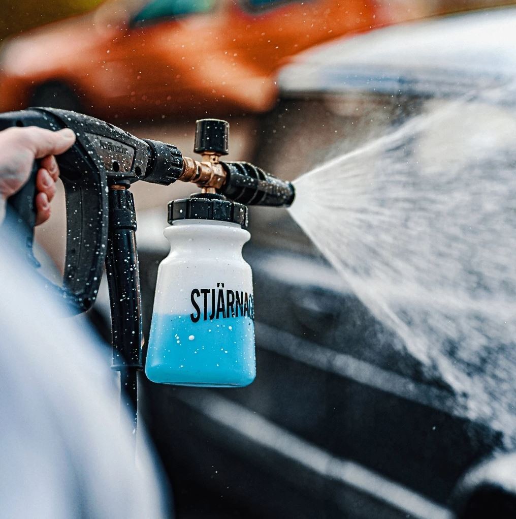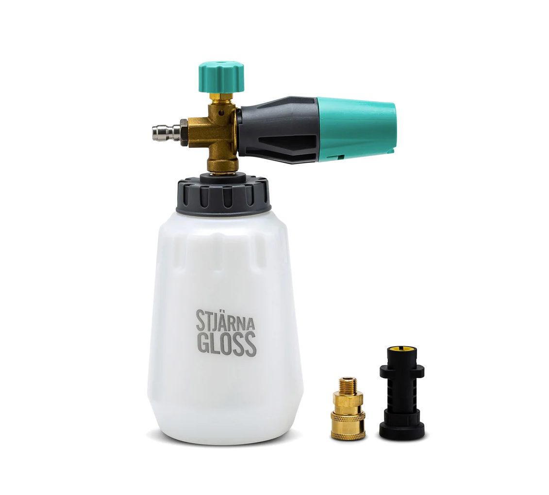Пенна насадка за измиване на автомобила с активна пяна, с дозираща бутилка с обем 1 литър, възможност за регулиране (горен бутон) и регулируема дюза. Достатъчно е да се свърже към високонапорна пералка Kärcher K Series (2023 ->) и резултатът е плътна пяна, подобна на бръсначна пяна, която е подходяща за предварително измиване или за измиване на по-малко замърсени автомобили. Тази насадка от серията Kärcher K се доставя с месингово свързване и пластмасов адаптер на серията Kärcher K, предназначена изключително за високонапорни пералки от серията Kärcher K. Голямо предимство е широката долна част, която предотвратява преобръщането на бутилката, както и бързата връзка за бързо свързване към пералката. Благодарение на широкия отвор е лесно да се налее както активна пяна, така и вода.