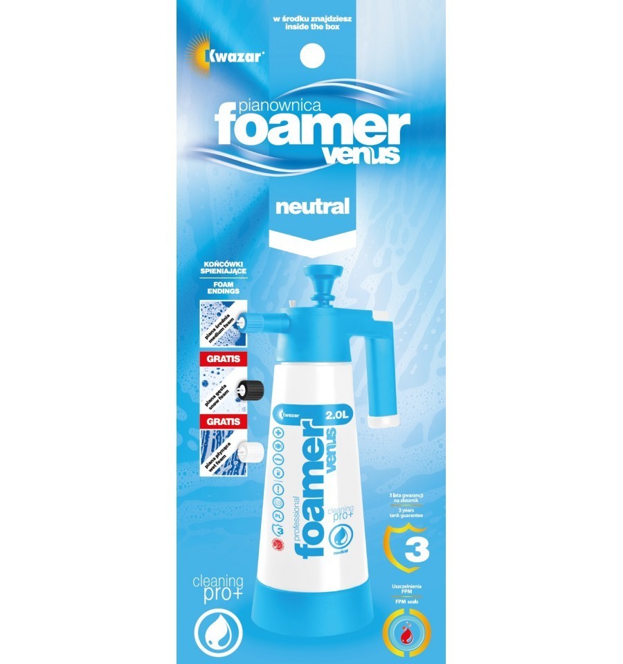 Ръчният пенообразувач Kwazar Venus Super Foamer е устройство, предназначено за нанасяне на пенообразуващи препарати - активни пяни. Използва се в автомивки и автосервизи, главно за предварително измиване на автомобили или почистване на джанти и двигателното пространство. (Може да се използва и за локално миене на фасади на сгради.) Комплектът включва 3 накрайника за пяна за гъста, средна и течлива пяна.Основни характеристики