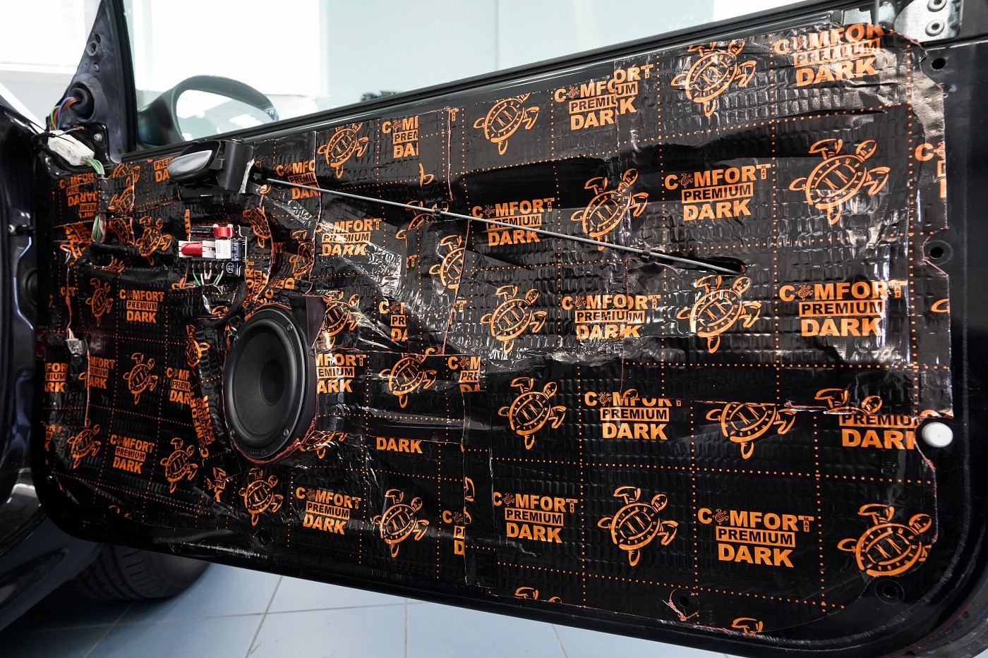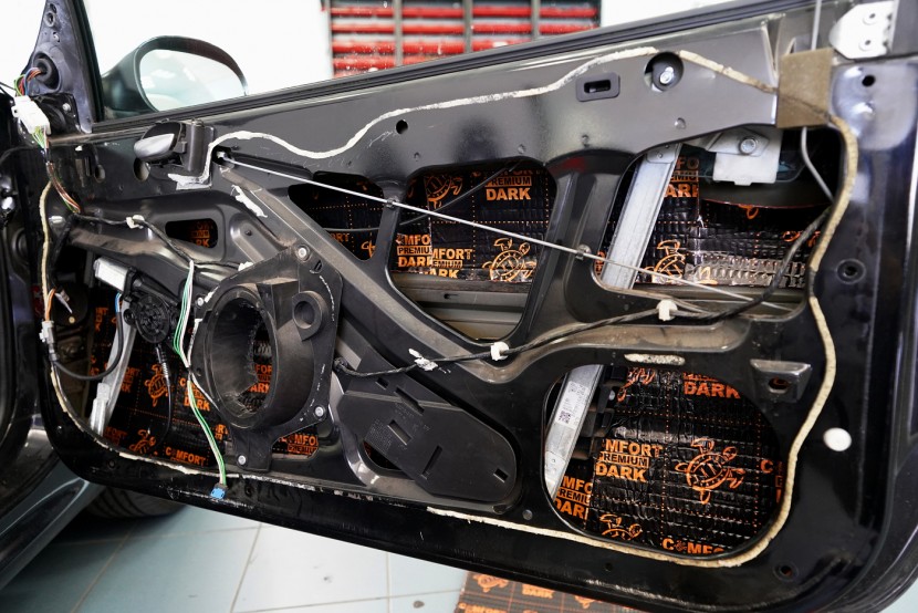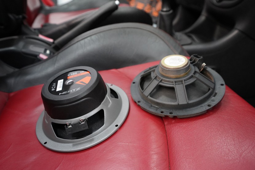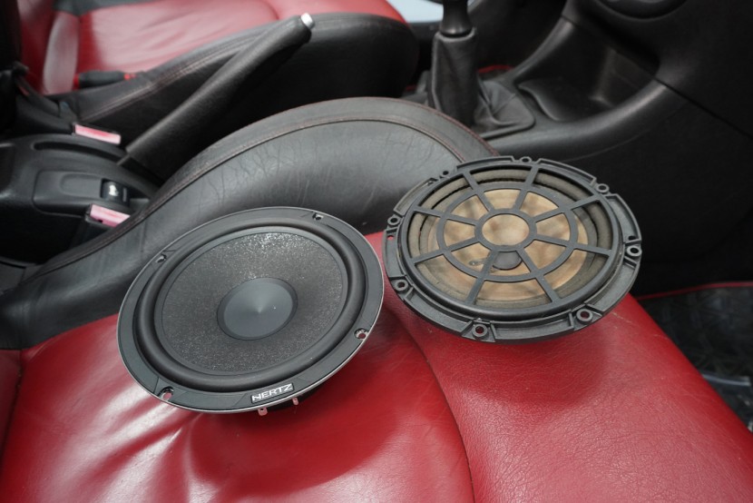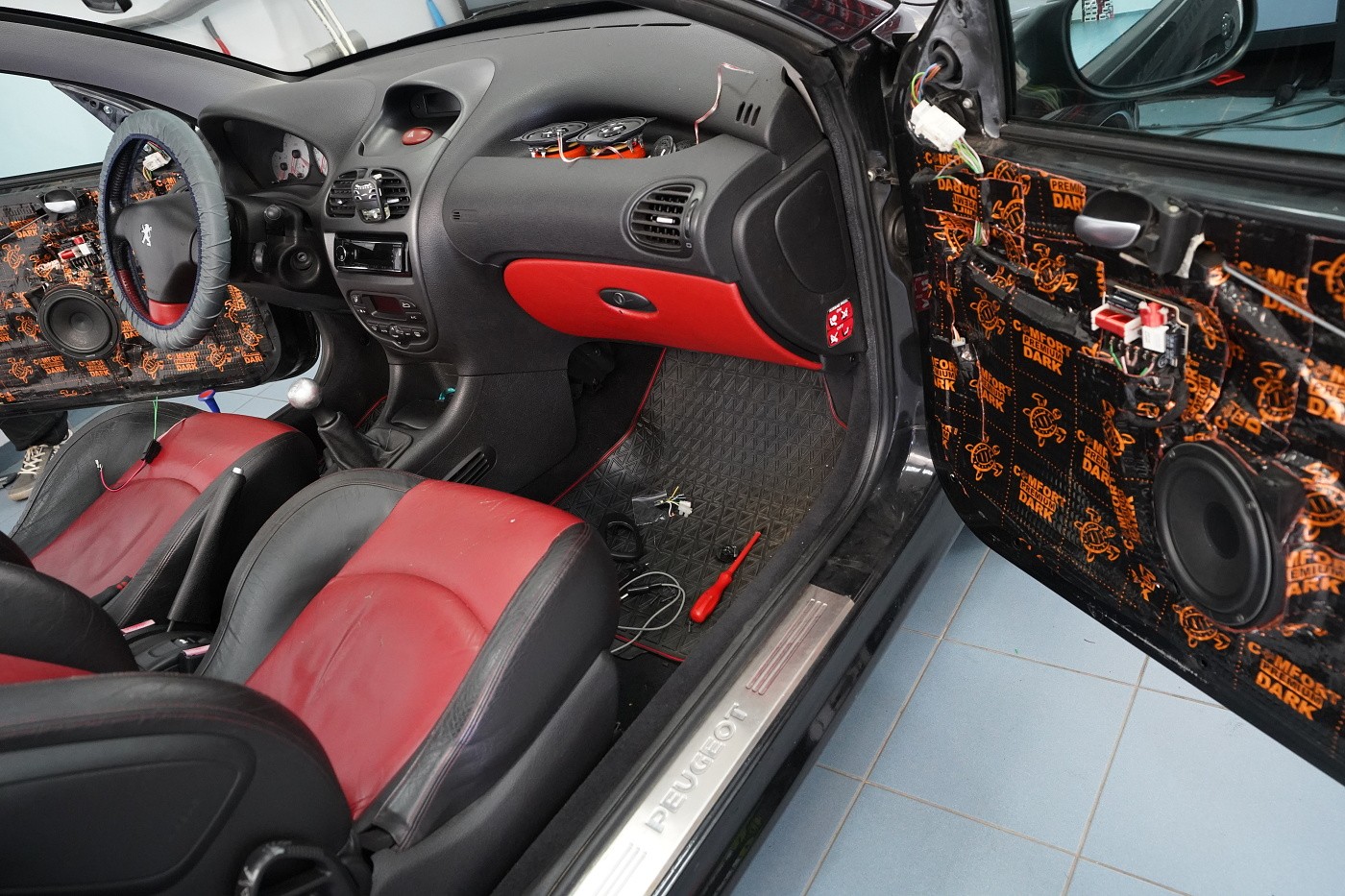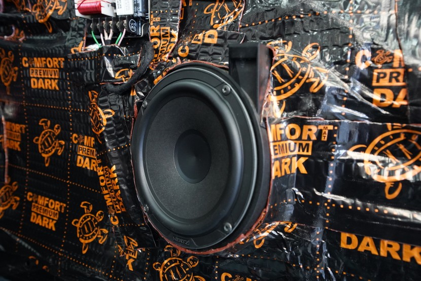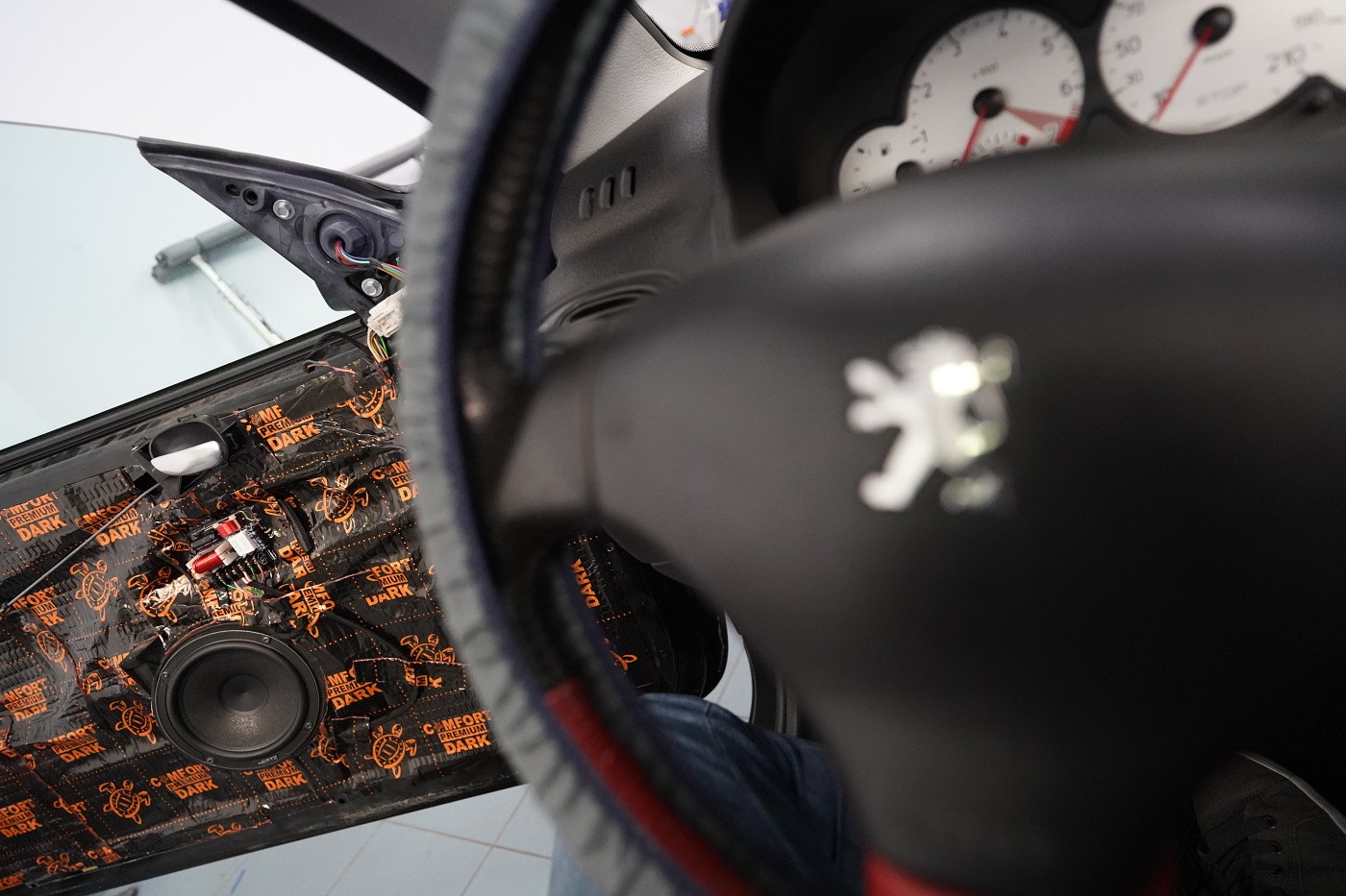 Монтаж на автордио и говорители в Peugeot 206 CC. За тази монтажна работа избрахме комплект говорители Hertz, конкретно популярните компонентни Hertz CK 165 за предните врати и коаксиите от серията Dieci за задното пространство. Нов източник на музика за автомобила е безмеханичното автордио Kenwood. За да изцедим максимума от говорителите, беше необходимо да демпфираме добре вратите, които в този модел са необичайно прорязани. Първо демпфираме външния метал с премиум антивибрационния материал Comfortmat Dark D2. Следва ултралек шумопоглъщащ материал Comfortmat Vision, който много ефективно шумоизолира вратите с минимално увеличение на теглото. Зад говорителя залепваме акустичния материал Comfortmat Tsunami, който ще предотврати стоящи вълни зад говорителя и значително ще подобри звученето на среднобасовия говорител. Последната фаза е затварянето на вратата с още един слой антивибрационен материал Comfortmat Dark D2, което не само предотвратява вибрациите на вътрешния метал, но и особено подобрява басовата част на говорителите. Това осигурява много по-голяма динамика и способност да възпроизведат ниски честоти, тъй като за говорителите сме създали затворена акустична кутия. Благодарение на изключителната чувствителност на избраните говорители и сравнително високата мощност на автордиото Kenwood, говорителите Hertz сега могат да възпроизведат много динамичен и без изкривяване звук дори при високи нива на звука.
