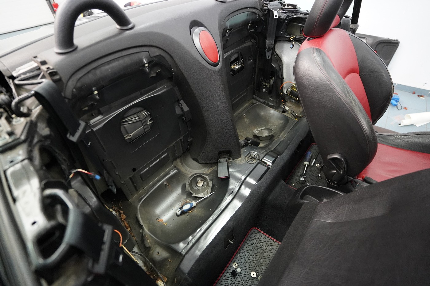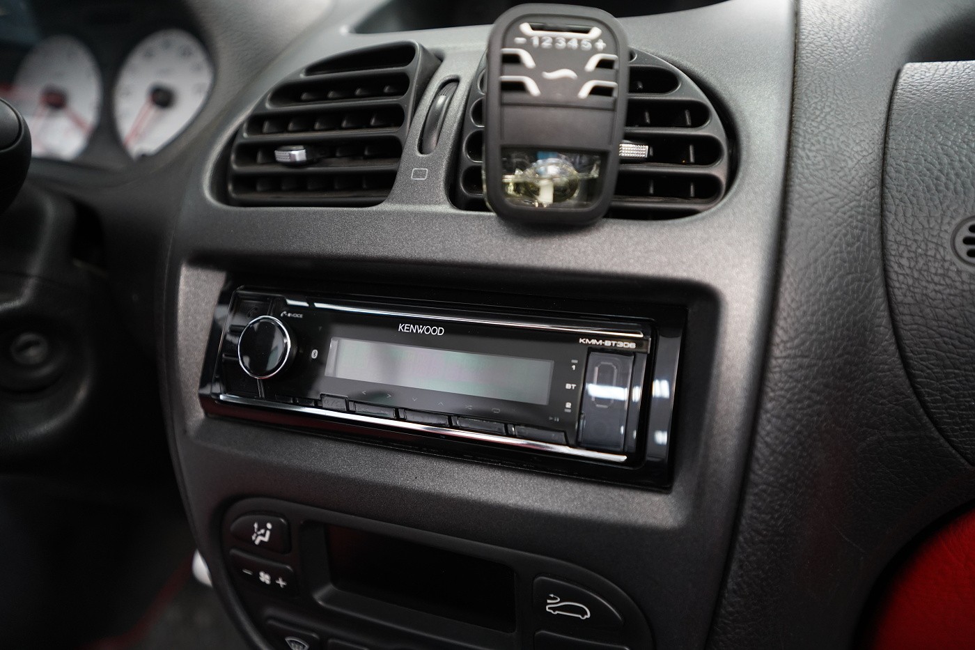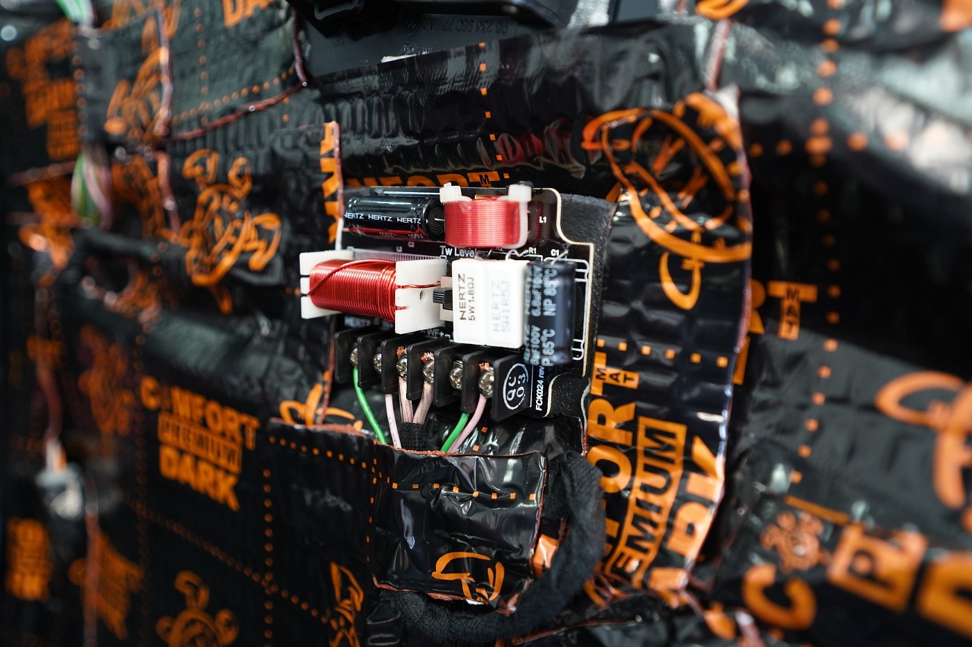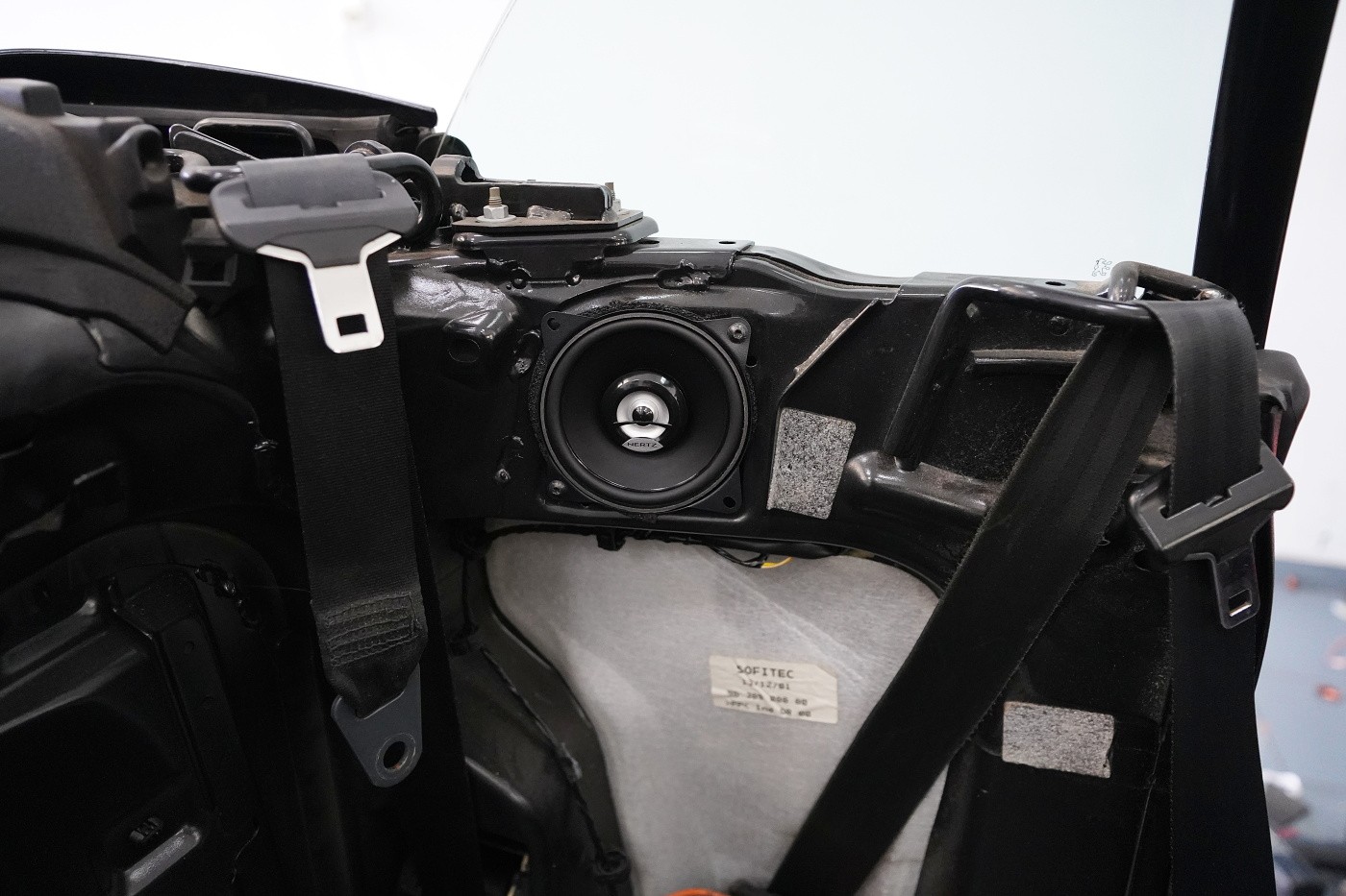 Монтаж на автордио и говорители в Peugeot 206 CC. За тази монтажна работа избрахме комплект говорители Hertz, конкретно популярните компонентни Hertz CK 165 за предните врати и коаксиите от серията Dieci за задното пространство. Нов източник на музика за автомобила е безмеханичното автордио Kenwood. За да изцедим максимума от говорителите, беше необходимо да демпфираме добре вратите, които в този модел са необичайно прорязани. Първо демпфираме външния метал с премиум антивибрационния материал Comfortmat Dark D2. Следва ултралек шумопоглъщащ материал Comfortmat Vision, който много ефективно шумоизолира вратите с минимално увеличение на теглото. Зад говорителя залепваме акустичния материал Comfortmat Tsunami, който ще предотврати стоящи вълни зад говорителя и значително ще подобри звученето на среднобасовия говорител. Последната фаза е затварянето на вратата с още един слой антивибрационен материал Comfortmat Dark D2, което не само предотвратява вибрациите на вътрешния метал, но и особено подобрява басовата част на говорителите. Това осигурява много по-голяма динамика и способност да възпроизведат ниски честоти, тъй като за говорителите сме създали затворена акустична кутия. Благодарение на изключителната чувствителност на избраните говорители и сравнително високата мощност на автордиото Kenwood, говорителите Hertz сега могат да възпроизведат много динамичен и без изкривяване звук дори при високи нива на звука.