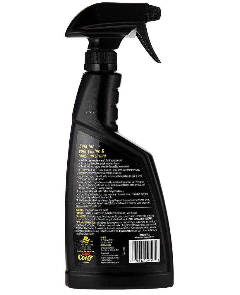 Meguiar’s Engine Cleaner е мощен и същевременно щадящ почистващ препарат за двигателя, предназначен за ефективно отстраняване на мазнини, замърсявания и обичайни нечистотии. Неговата специална химична формула е проектирана да почиства безопасно не само лакирани и нелакирани метални части под капака, но и пластмасови капаци, гумени маркучи и други чувствителни повърхности без риск от повреда или промяна на външния вид. Продуктът позволява бърза и ефективна поддръжка на двигателя и околните части — достатъчно е да се нанесе, да подейства кратко, да се почисти и избърше. В същото време помага да се освобождат натрупвания, улеснява дълбокото почистване и подготвя повърхностите за последваща защита. По този начин двигателното отделение изглежда като ново и е готово за следващите пътувания.