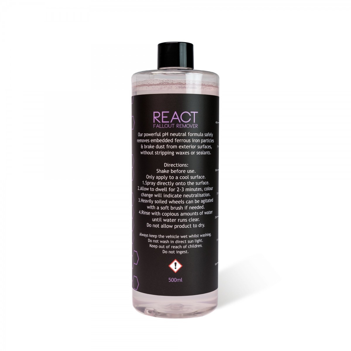 Carbon Collective React Fallout Remover е щадящ почистител за джанти и премахвач на летяща ръжда в едно. Обновената формула на React е още по-ефективна и позволява по-продължително действие на препарата върху повърхността. Carbon Collective React е един от малкото премахвачи на летяща ръжда с приятен аромат и без неприятна миризма. React е почистващ препарат без киселини, мощен, но въпреки това pH неутрален, безопасен за употреба на почти всички външни повърхности и финиши. Съдържа специално вещество, което реагира при контакт с железни частици и ги разтваря. В опаковката е включен и химически устойчив пулверизатор.