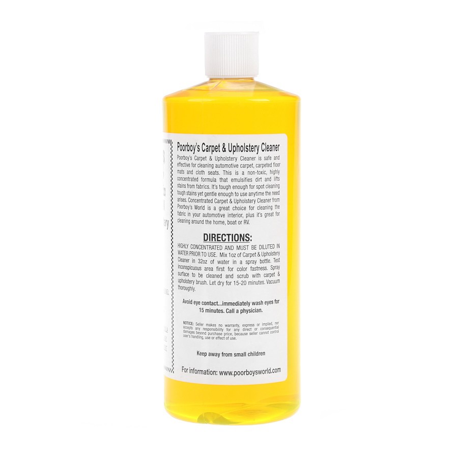 Poorboy's Carpet and Upholstery Cleaner е безопасен и ефективен препарат за почистване на килими и текстилна тапицерия в автомобила. Това е нетоксичен, високо концентриран продукт, който емулира замърсяванията и повдига петната от повърхността на тъканта или килима. Достатъчно ефикасен за отстраняване на всички петна, въпреки това не изисква изплакване след употреба. Концентрираният почистващ препарат за килими и тапицерия от Poorboy's World е отличен избор за почистване на текстили и тъкани в интериора на автомобила.