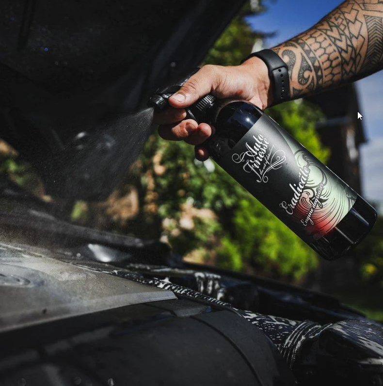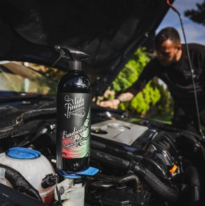 Auto Finesse Eradicate Engine Degreaser е дълбокопочистващ препарат за двигатели и моторни отделения. Eradicate е разработен за ефективно дълбоко почистване на мазни и "закърпени" пътни замърсявания, които по автомобилите се срещат предимно под капака. Eradicate е силно пениращ обезмаслител, подходящ за употреба върху всички повърхности като метал, пластмаса, гума, боя и т.н. Благодарение на своите почистващи способности е перфектен и за почистване на подкалници и прагове. Както всички продукти Auto Finesse, така и Eradicate принадлежи към професионалните продукти, предназначени за опитни специалисти по детайлинг. Благодарение на високата ефективност и лесната приложимост, с този препарат страхотни резултати ще постигне дори начинаещ.