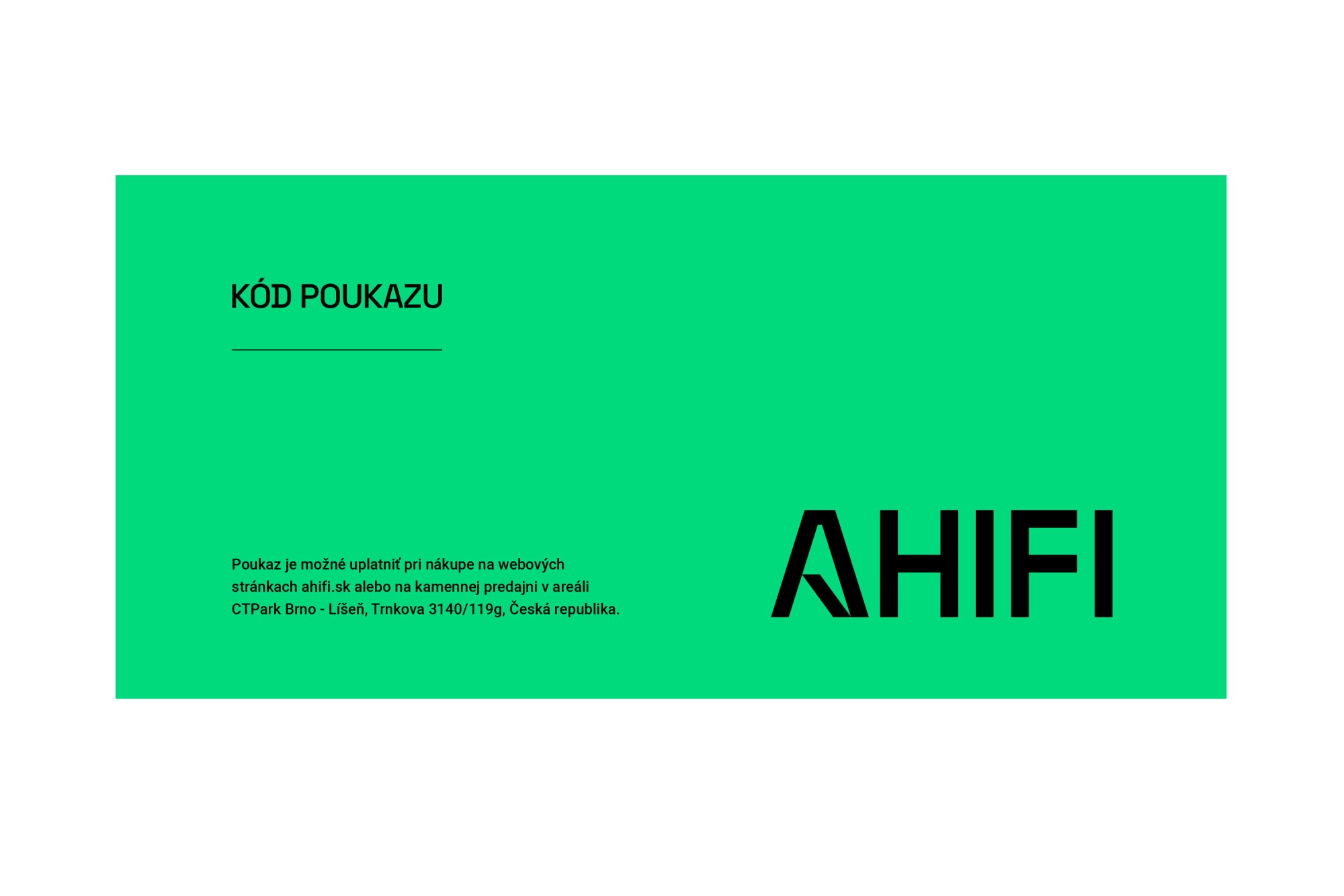 Подаръчният ваучер лесно решава въпроса с подаръка за вашите близки и приятели. Ваучерът може да се закупи в печатен и електронен вид и може да се използва за целия асортимент в eshopu ahifi.sk или във физическия магазин в Brno в Чешката република. Печатните ваучери са изработени от качествен кекстов хартия с висок грамаж 350 g/m² и двустранно матово ламиниране. Ваучерът е идеален подарък, който ще зарадва всеки автомобилен фен. Можете да избирате стойности 20, 40, 80 и 120 €.