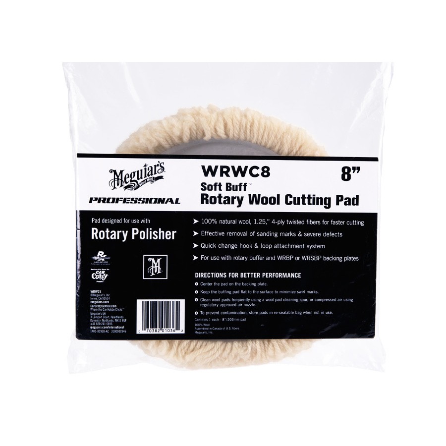 Meguiar’s 8″ Soft Buff Rotary Wool Cutting Pad WRWC8 е професионален полиращ диск, изработен от 100% естествена овча вълна с плетени влакна с дължина 1,25" и четирислойна конструкция за максимална режеща ефективност. Този диск е проектиран за работа с ротационна полираща машина и позволява бързо и ефективно отстраняване на следи от шлайфане, окисляване и по-дълбоки дефекти в лака, като използва система за бърза смяна с велкро (hook & loop) за лесно закрепване. Идеален избор за детайлинг работилници и опитни авто-козметични ентусиасти, които търсят висока производителност при корекция на лака.