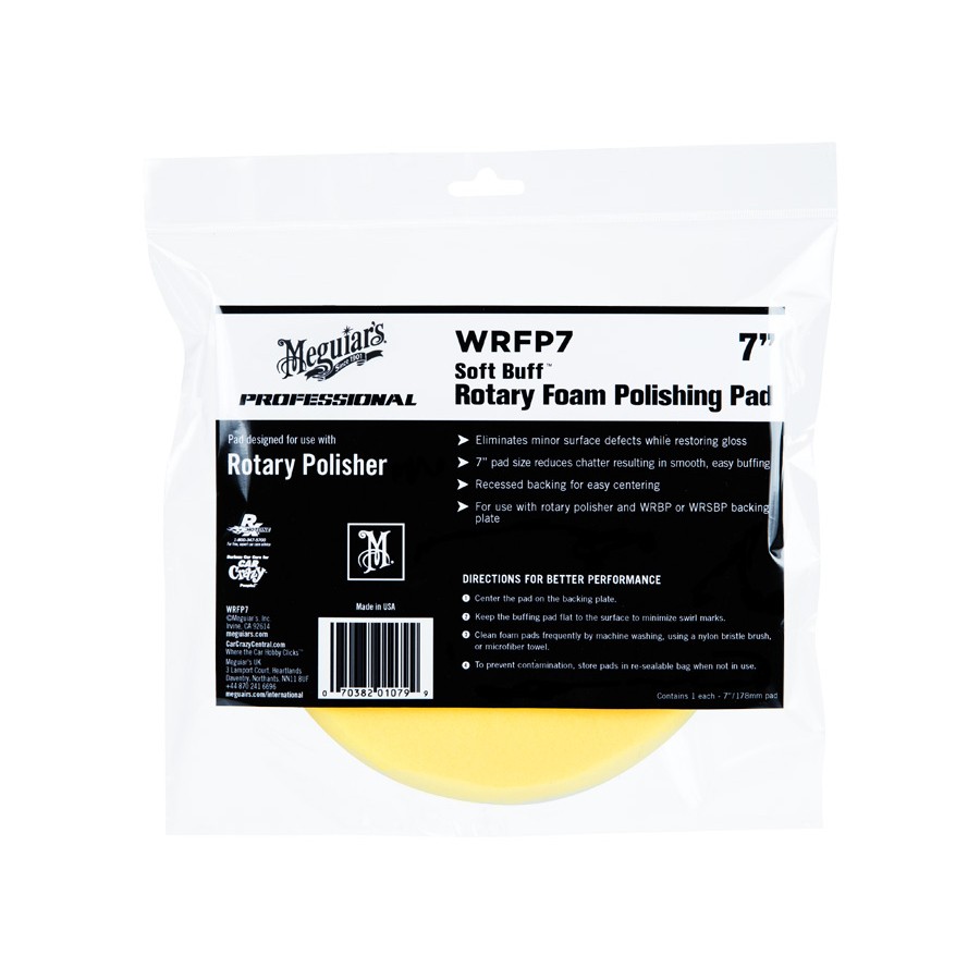 Meguiar’s 7" Soft Buff Rotary Foam Polishing Pad (модел WRFP7) е висококачествен диск, предназначен за професионално възстановяване на автомобилния лак с помощта на ротационни полиращи машини. Благодарение на новата пяновата технология той позволява ефективно отстраняване на дребни до средни повърхностни дефекти по лака (напр. фини драскотини, следи от завихряния) и в същото време възстановява високия блясък на повърхността. Диаметърът 7" (~178 mm) допълнително помага за намаляване на вибрациите ("chatter") по време на работа, което подобрява комфорта и качеството на резултата. Дискът има запусната подложка за лесно центриране и се закрепва чрез система hook & loop, което позволява бърза смяна и стабилно фиксиране. За оптимална производителност е предназначен за употреба с ротационна полираща машина и съвместими носачи на Meguiar’s.