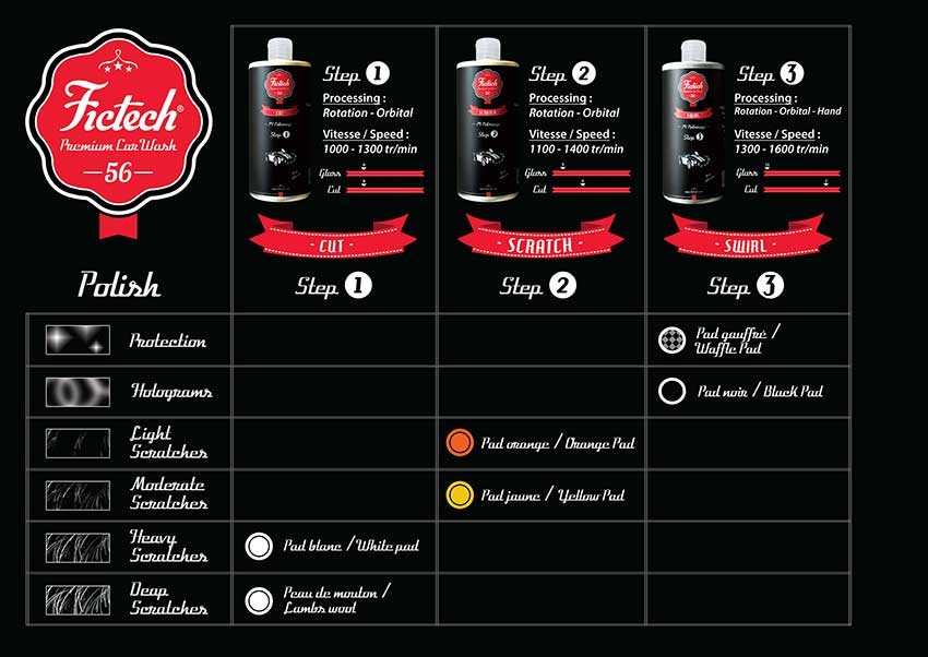 Първокласна мощна полираща паста, която лесно може да отстрани малки до средни дефекти в боята. Пастата се отличава с висока ефективност дори при твърди лакове. Като следваща стъпка препоръчваме да използвате Fictech Swirl. При Fictech тази паста се използва като стъпка 2 - STEP 2.