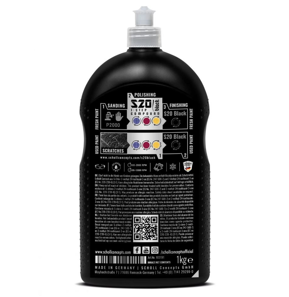 Визионерска и уникална едностъпкова, високопроизводителна смес, обхващаща широк спектър от приложения върху всички обичайни лакови системи. Детайлизирането на повехнали и надраскани лакови повърхности никога не е било толкова просто! Благодарение на непрекъснатото усъвършенстване на iPT Powder Technology, в Scholl успяха да разработят паста, която бързо и без усилие отстранява дълбоки драскотини и възстановява повехнали повърхности в един единствен етап, независимо от твърдостта на системата на топ-лака. Въпреки огромната си шлифовъчна мощност, впечатляващият огледален блясък е забележителен. Дори холограми и вихрови следи върху тъмни повърхности могат лесно да бъдат полиратни. С използването на правилната подложка S20 Black Polishing Pad винаги ще постигнете висока блясък в един етап. Real 1-Step Polish е проектиран за приложения с ротационни полир машини. Въпреки това, S20 Black може лесно да бъде приложен и с модерна високоходова двуосцилаторна полираща машина.За марката